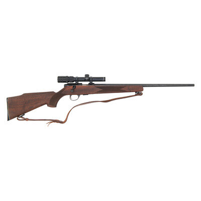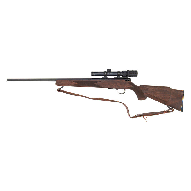 .22 LR. 22.5" barrel length. SN: 706247. Blued metal finish with matte bolt set in walnut Monte-Carlo style stock with bordered multipoint checkering to the wrist and forend mounting white line spacer to SAKO synthetic butt. Bolt-action detachable magazine fed repeating rifle with dovetail rail to receiver mounting a Charles Daly marked WATERPROOFED/D=20/JAPAN marked 1.5-4X telescopic sight. Standard model markings to the rifle include P72 to left receiver and MADE IN FINLAND on left barrel. Barrel drilled and tapped in four places for mounting iron sights with none present, and all thread protecting screws absent. comes with a KASSNAR/MADE IN SPAIN tooled leather sling. Underside of barrel marked IMPORTED BY STOEGER.