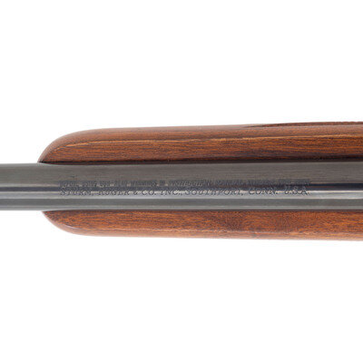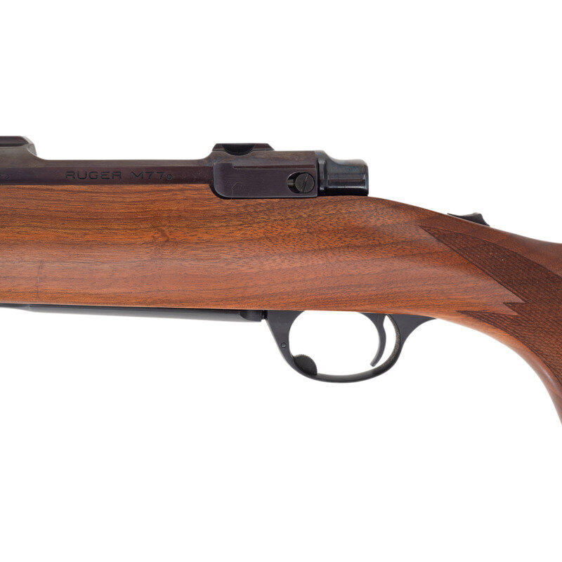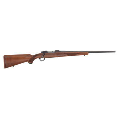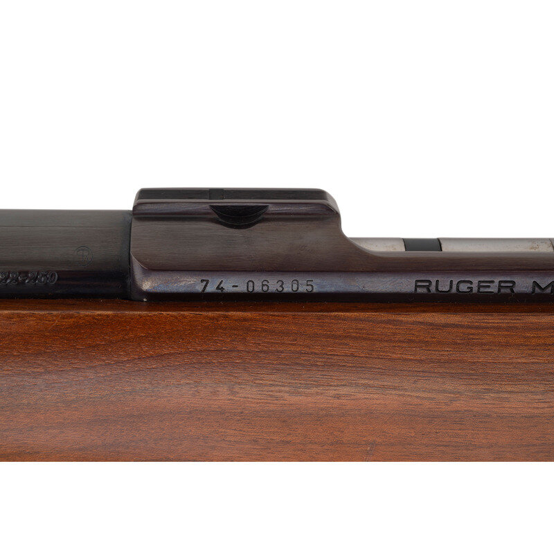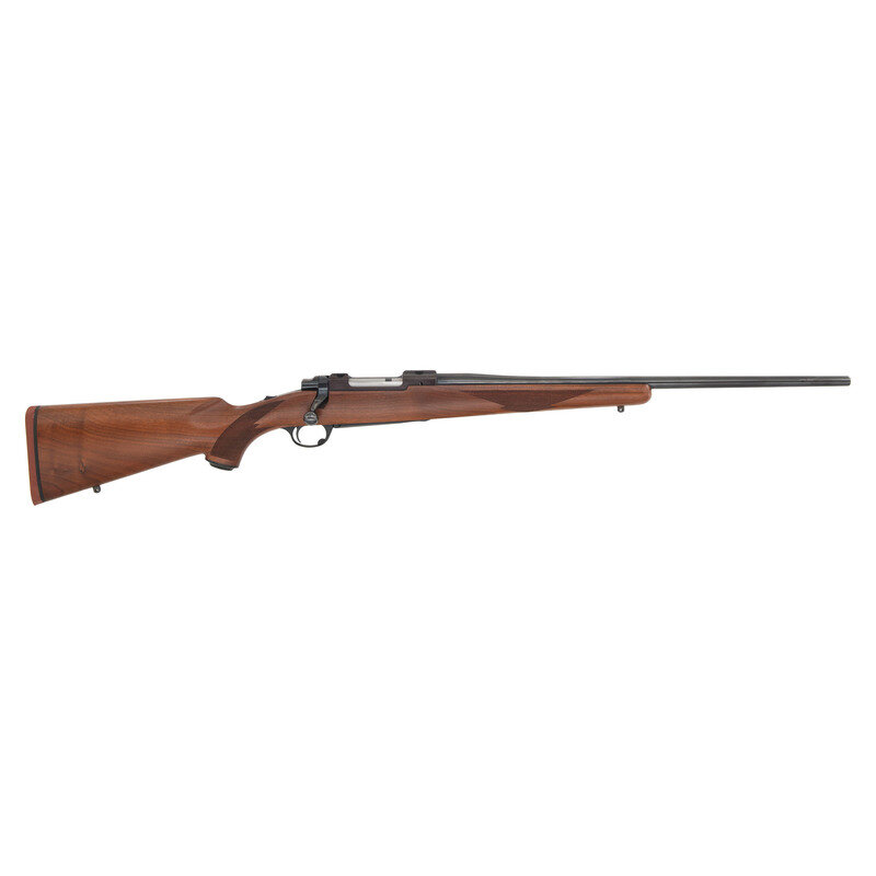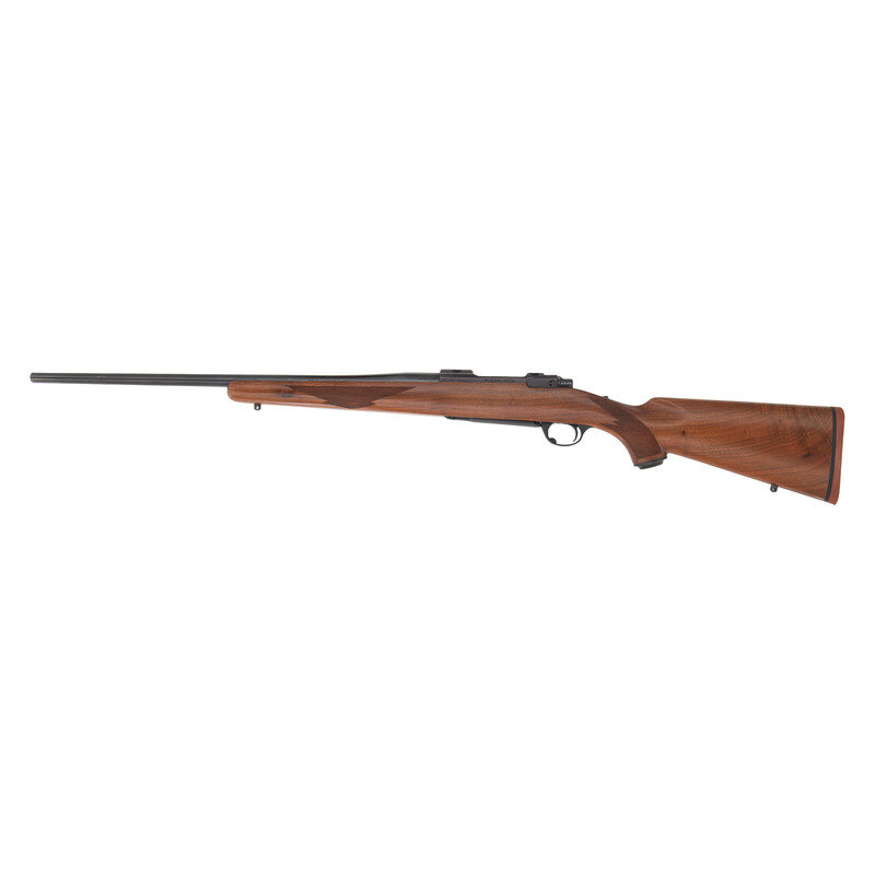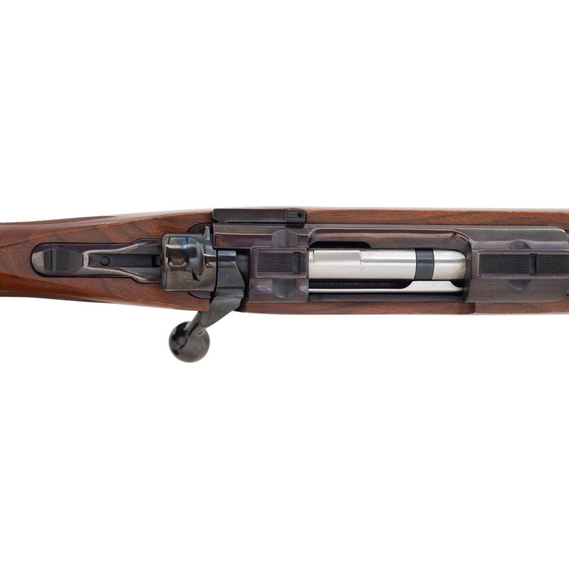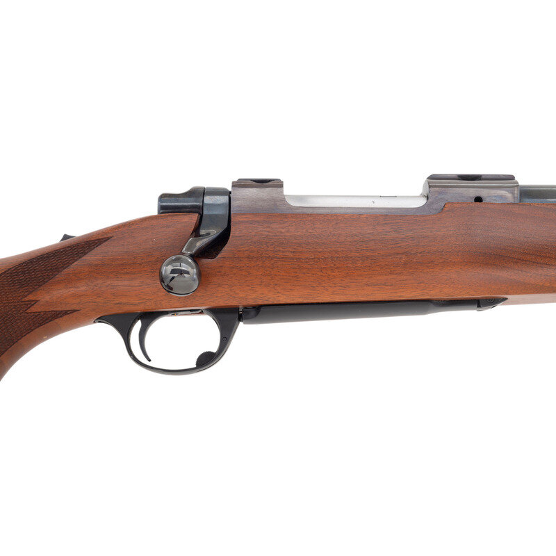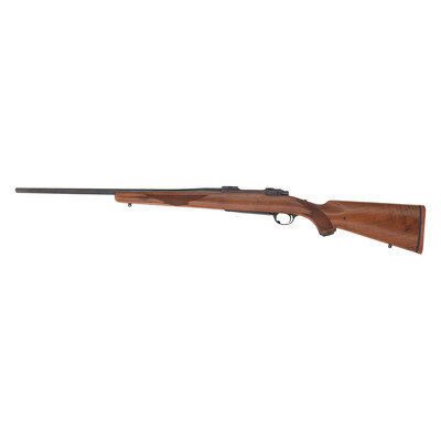 .22-250 Remington. 22" barrel length. SN: 74-06305. Blued metal finish, receiver has a plum color to it. Walnut stock has checkering to semi pistol grip and forearm. Bolt action rifle with an internal magazine, double sling studs, and a rubber recoil pad. Item is without sights, but has scope rail to top of receiver.