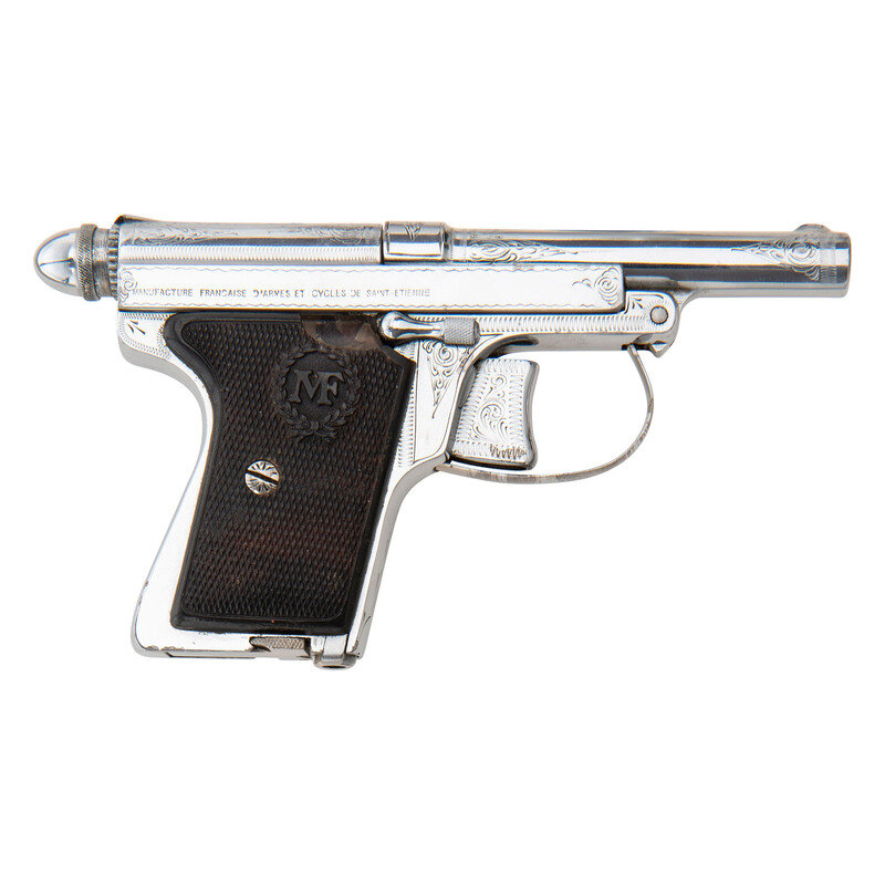 .25 ACP. 3.4" barrel length. SN: 120441. Nickel plated metal finish with checkered black synthetic MF logo grips and featuring engraved embellishments overall. Simple blowback operated striker action autoloading pistol fed by detachable single stack magazines and featuring a tilting barrel. Right slide shows the manufacturer marking MANUFACTURE FRANCAISE D'ARMES ET CYCLES DE SAINT ETIENNE with left slide struck TYPE POLICEMAN and the top featuring LE FRANCAIS within oval. Item shows wiggle line engraved borders on the frame and slide with further floral engraving on the triggerguard, front and rear barrel, and forward frame.