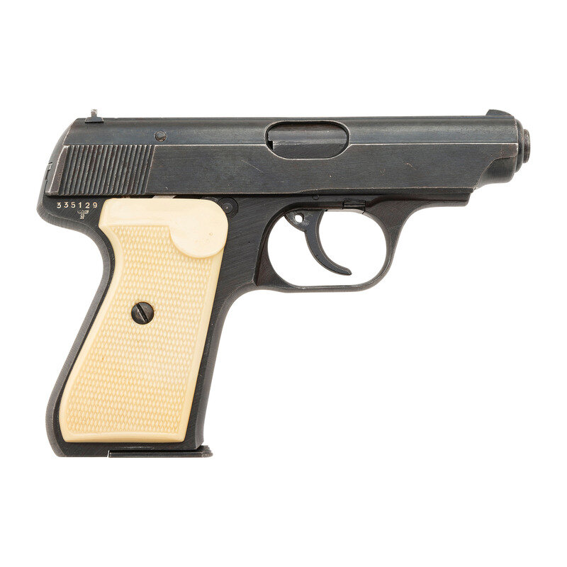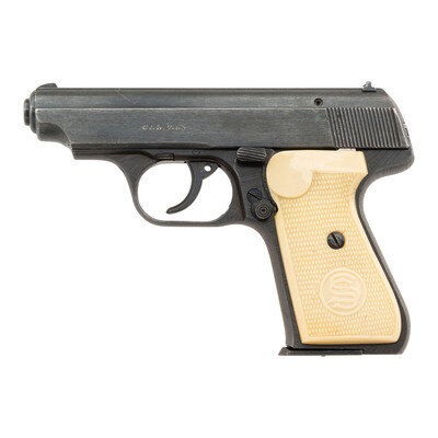 .32 ACP. 3.4" barrel length. SN: 335129. Blued military finish to metal parts mounting aftermarket FRANZITE synthetic ivory grips and standard drift adjustable rear notch with front blade sights. Short-recoil operated concealed hammer DA/SA autoloading pistol fed by detachable single stack magazines. Item shows German {Eagle/N} commercial proofs to the rear frame below the serial number, and to the right muzzle. Left slide struck CAL. 7,65 with the pistol otherwise unmarked on exterior. Slide and breechblock are numbered 488, and do not match frame number. Magazine shows the SUS monogram and CAL. 7,65 to the floorplate. Grips feature the SUS Sauer Und Sohn monogram to the left panel. Tip of the extractor has broken off and must be replaced.