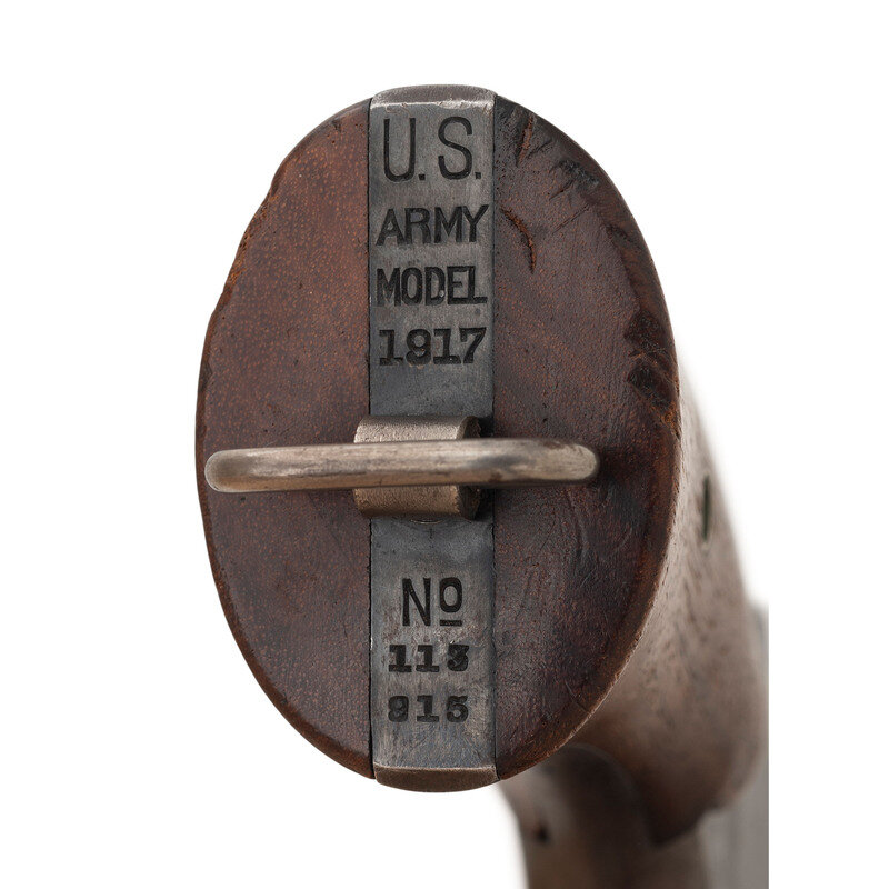 .45 ACP. 5.5" barrel length. SN: 113915. Blued metal finish with case colored hammer and trigger mounting smooth walnut grip panels and lanyard loop to butt. Double action six-shot hand ejector revolver featuring a pinned barrel on five screw frame. Sights consist of standard topstrap notch and half-moon front blade sights. Item displays various government service and inspection markings including U.S./ARMY/MODEL/1917 on the butt, "UNITED STATES PROPERTY" below the barrel, and the {Ordnance Bomb} on the left frame forward of the hammer. Left frame struck {Eaglehead/S21} above the triggerguard with {Eaglehead/S24} stamp to the rear cylinder and a further {Eaglehead} on the barrel near serial number. Left barrel marked S.&W. D.A. 45 with two-line address and patent marks to the top of the barrel reading SMITH & WESSON SPRINGFIELD MASS. U.S.A./PATENTED DEC. 17. 1901. FEB. 6. 1906. SEP. 14. 1909. Sideplate shows no Smith & Wesson monogram marking. Serial numbers match on the frame, cylinder, barrel, and extractor. Serial number written in pencil on the inside of the right grip panel.