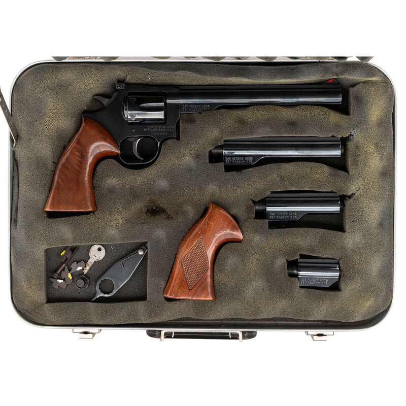 .357 Magnum. 8" barrel length. SN: 80584. Polished blued metal finish with matte hammer and trigger mounting smooth walnut one piece grips, adjustable white outline rear and pinned matted front ramp sights on a full length matte blued barrel rib. Double action six-shot hand ejector revolver fitted with Dan Wesson pattern removable barrels. Item shows standard markings including DAN WESSON ARMS/MONSON, MASS. U.S.A. to the right frame. Comes in an aftermarket hard case with three additional barrels including 2.5", 4", and 6" options, all with Dan Wesson Arms markings. Also comes with a used diamond checkered grip. Included in the box are a barrel wrench, four front sights, grip mounting screw, and the key to the case.