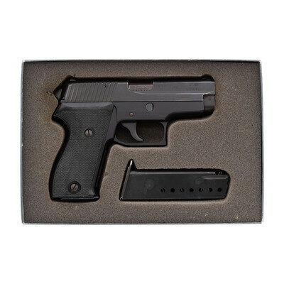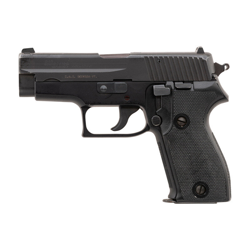 9mm Para. 3.9" barrel length. SN: M643611. Parkerized metal finish with black anodized frame mounting checkered black synthetic grips with two-dot factory sights. Short recoil operated DA/SA autoloading pistol fed by detachable single stack magazines. Item shows the model marking P6 on the right slide followed by NRW and with date marking 09/98. Standard German firing proofs to major components. Left slide is struck SIG SAUER MADE IN GERMANY above the importer marking C.A.I. GEORGIA VT. Comes in a non matching case for a P225 with two magazines, owner's manual, and the factory test target.