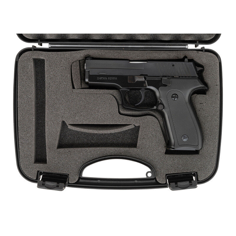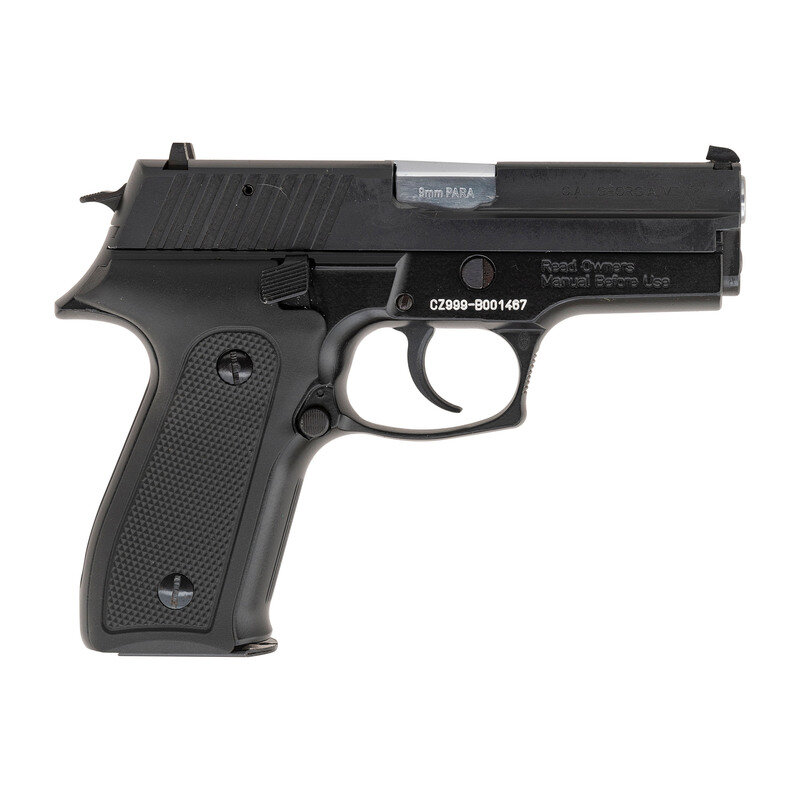 9mm Para. 3.86" barrel length. SN: B001467. Parkerized metal finish with polished barrel, black anodized frame, and mounting checkered black synthetic grips. Short recoil operated DA/SA autoloading pistol fed by detachable double stack magazines and following the pattern of the Sig P229 pistol. Item features triple dot pattern sights, an ambidexterous magazine release, and combination slide stop/decocker. Standard English language make and model markings including importer mark to right slide reading C.A.I. GEORGIA, VT. Comes in a matching black synthetic case with the owner's manual and one magazine.