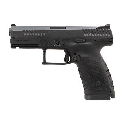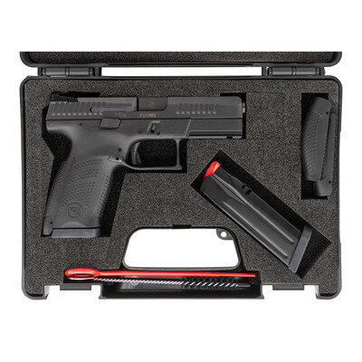 9mm Para. 4.02" barrel length. SN: F299222. Black Nitride finish overall mounting black synthetic frame with accessory rail to the forward frame and interchangeable backstraps. Short-recoil operated striker-action autoloading pistol fed by detachable double stack magazines and mounting triple dot sights. Standard make and model markings appear including Czech firing proofs to the slide and the barrel. Item comes in a black synthetic hard case with two magazines, two backstrap options, owner's manual, cable lock in package, bore brush, and synthetic cleaning rod.