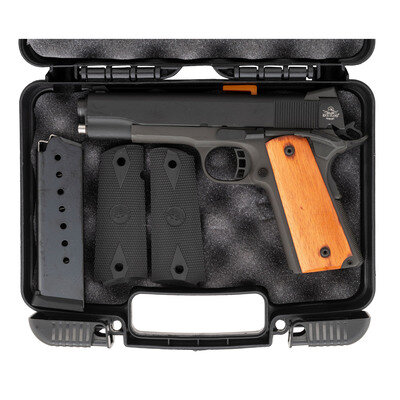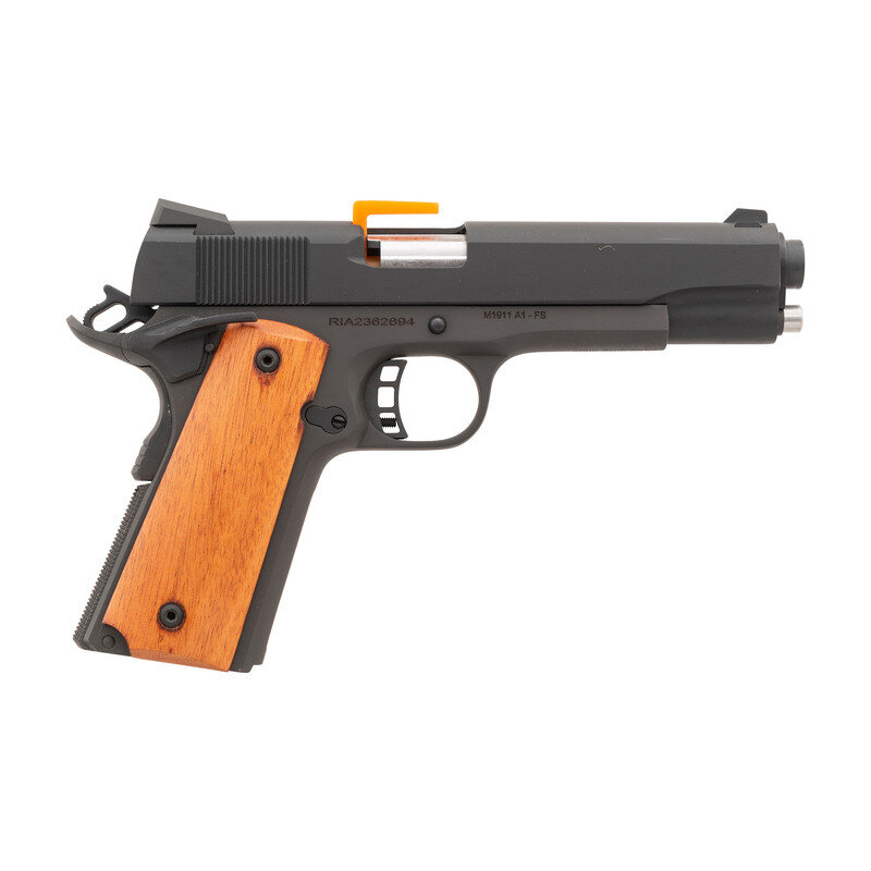 .45 ACP. 5" barrel length. SN: RIA2362894. Parkerized metal finish with bright finished breech mounting smooth walnut grips and mounting Novak pattern sights. Short-recoil operated single action autoloading pistol fed by detachable single stack magazines. Item follows the 1911A1 pattern with numerous factory modifications including: vertically serrated forward frame, flat knurled mainspring housing, extended Memory Line pattern beavertail grip safety, ambidexterous and extended safety lever, adjustable trigger, and skeletonized commander hammer. Item shows standard make and model markings including ROCK ISLAND/ARMORY marking on the left slide, and M1911 A1-FS on the right frame. Further struck with the importer mark on the forward frame APINTL-PAHRUMP NV/ACP PHILIPPINES. Item comes in a matching black synthetic hard case with: one magazine, spare black synthetic grips, factory test casing in package, and the owner's manual.