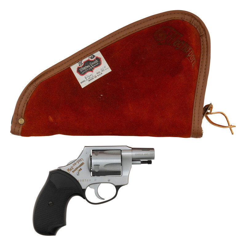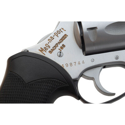 .44 Special. 1.875" barrel length. SN: 498744. Brushed stainless steel overall with matte controls mounting black Anodized triggerguard and checkered black rubber Pachmayr grips. DAO five-shot hand-ejector revolver featuring a ported muzzle. Sights consist of the topstrap notch only without front sight. Right frame is struck with gold painted letters reading Mag-na-port/BACKPACKER/165. Standard caliber and maker markings appear on the barrel flanks. Item comes in a suede leather soft case with Mag-na-port logo to the exterior and a shoulder patch.