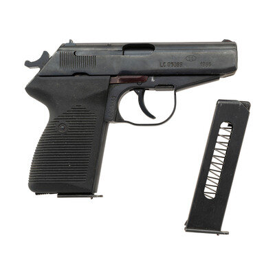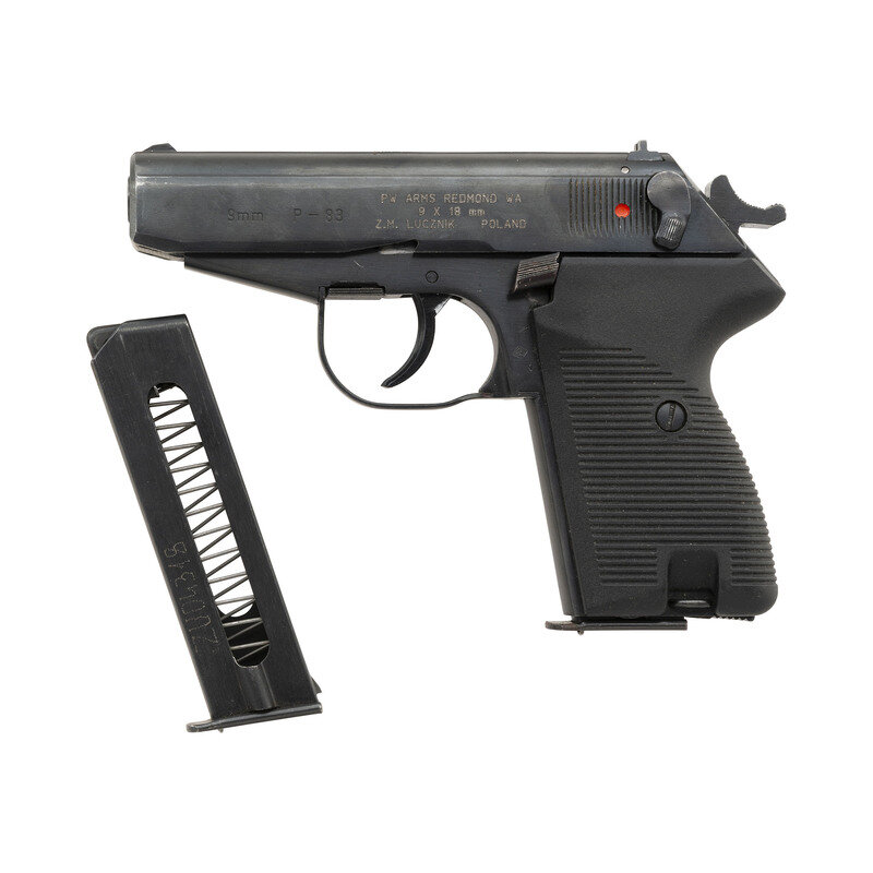 9x18mm Makarov. 3.5" barrel length. SN: LC05089. Blued metal finish overall mounting two-piece black synthetic grips with standard iron sights mounted on a matted slide top. Simple blowback operated DA/SA autoloading pistol fed by detachable single stack magazines. Item features a slide-mounted safety/decocker and heel type magazine release. Right slide shows the standard Polish {Circle 11} factory marking followed by a date mark of 1986. Left slide shows caliber and model markings 9mm P-83 followed by three line importer marking reading PW ARMS REDMOND WA/9 X 18 mm/Z.M. LUCZNIK POLAND. Item comes with two magazines, one with a matching serial number marked in electropen, along with the multi-tool/cleaning rod.