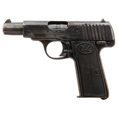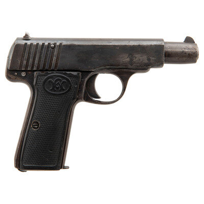 7.65mm. 3.5" barrel length. SN: 137756. Blued metal finish mounting checkered black syntthetic grips featuring Carl Walther initial monograms. Simple blowback operated internal hammer fired autoloading pistol fed by detachable single stack magazines. Item mounts military pattern drift adjustable rear notch and fixed front blade sights. Knurling to the safety lever typical of World War I era and post-war Walther Model 4 pistols. Left slide legend reads SELBSTLADE-PISTOLE CAL 7,65. WALTHER'S PATENT. above the WALTHER banner. Item shows standard {Crown/N} commercial proofs to the left chamber, left slide, and left frame. F.W.K. initials to the left triggerguard indicate the pistol was manufactured under license by F.W. Kessler of Suhl. Serial numbers match on the frame, slide, and barrel bushing.