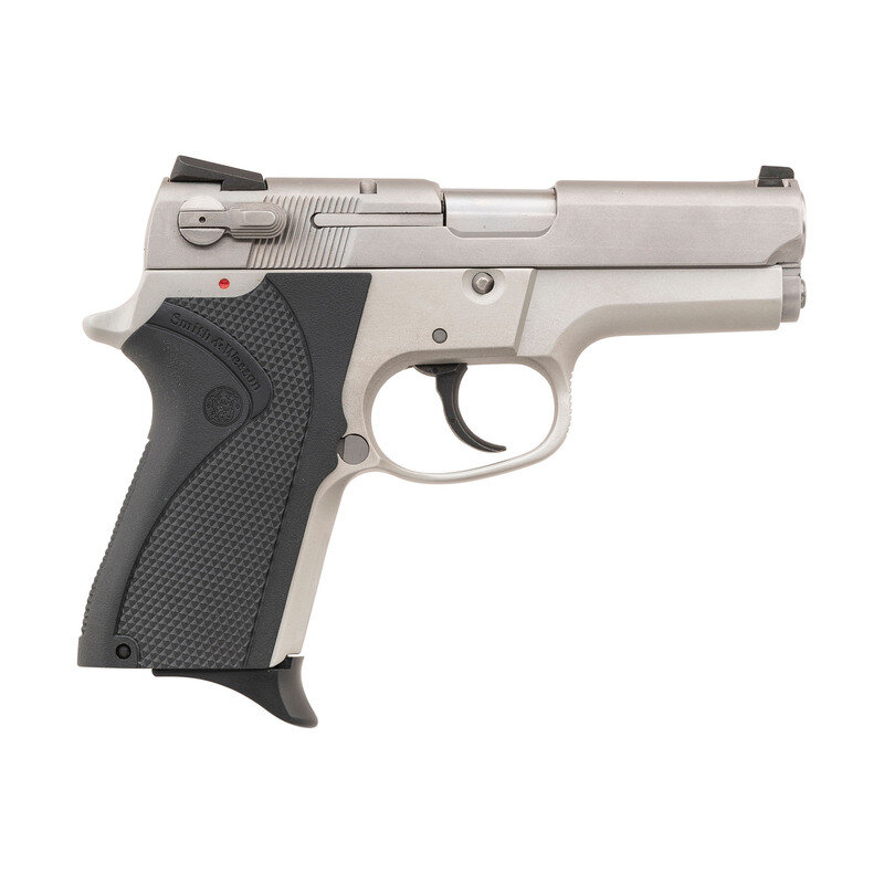 9mm Para. 3.5" barrel length. SN: BDK5645. Matte stainless steel and matte aluminum frame mounting black synthetic Smith & Wesson logo grips. Short recoil operated DA/SA autoloading pistol fed by detachable double stack magazines and featuring NOVAK'S triple white dot sights, and a bobbed hammer. Item shows standard make and model markings, including the single line address on the left frame over the model marking. Item comes in a matching blue plastic hard case with three 12-shot magazines, owner's manual, and the trigger lock in its package.