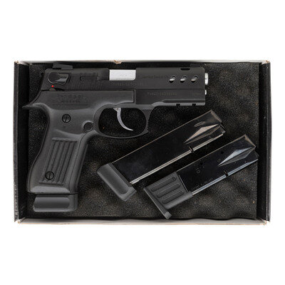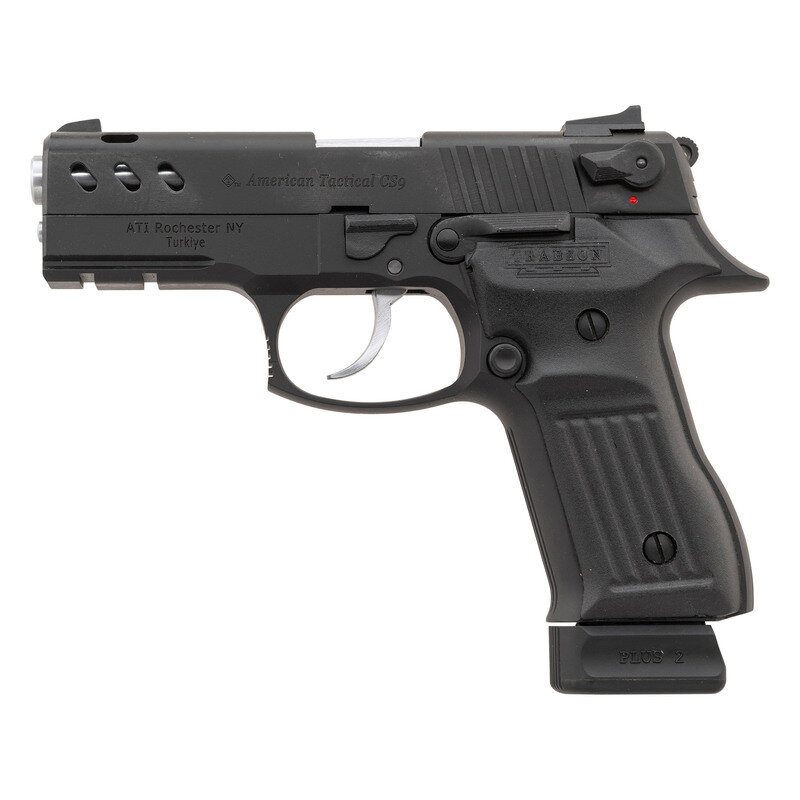 9mm Para. 4.25" barrel length. SN: T0620-09D04959. Parkerized metal finish with brushed finish to the barrel and trigger, ported barrel with vented slide, and mounting black synthetic grips. Short-recoil operated DA/SA autoloading pistol fed by detachable double stack magazines featuring ambidexterous safety/decocker and mounting triple dot sights. Slide is marked American Tactical CS9 on both sides with the left frame marked ATI Rochester NY/Turkiye. Comes in a black cardboard box with owner's manual, synthetic cleaning rod, trigger lock, two standard capacity magazines, and one ten-shot limited capacity magazine.