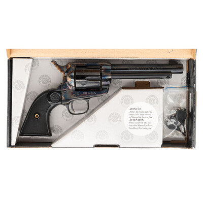 .357 Magnum. 5.5" barrel length. SN: Y1338564. Blued metal finish with color case hardened frame, hammer, and trigger mounting black synthetic Taurus logo grips. Single action loading gate revolver with six-shot cylinder mounting spring-loaded ejector rod and topstrap notch with front blade sights. Left frame is marked TAURUS INT. MFG./MIAMI, FL.-USA followed by {TAURUS} logo, while the right is struck MADE IN BRAZIL. Item comes in a matching black cardboard box with two internal safety locking system keys and the owner's manual.
