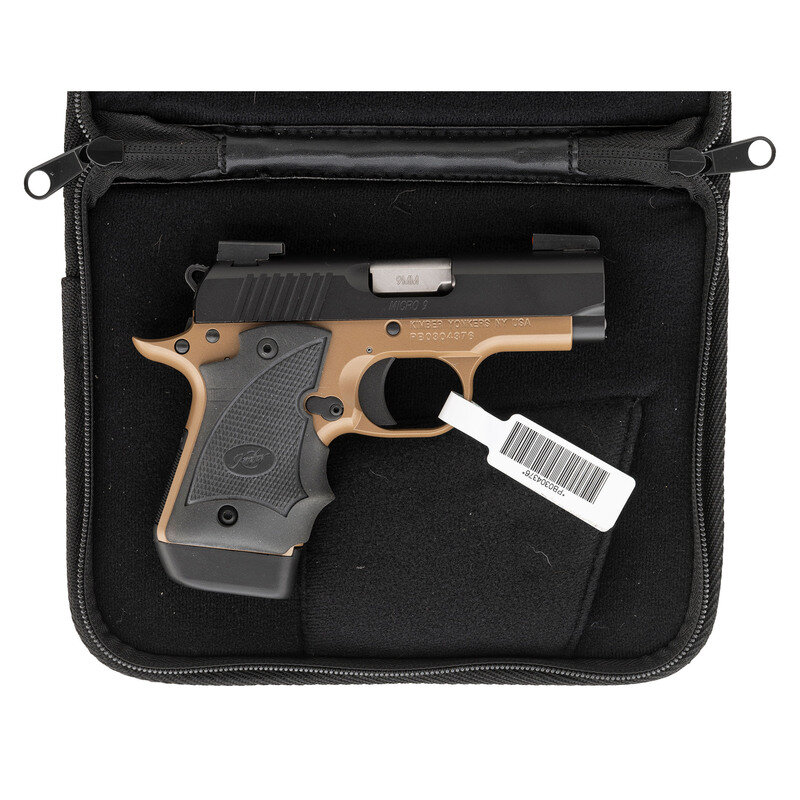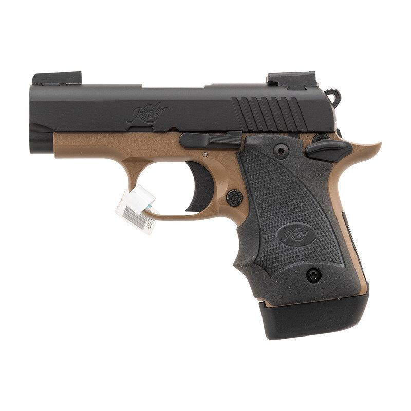 9mm Para. 3.15" barrel length. SN: PB0304376. Black KimPro finish with dark desert tan finish to frame and mounting black rubber Kimber logo grips. Short-recoil operated single-action autoloading pistol fed by detachable single stack magazines and mounting TRUGLO triple dot fiber optic sights. Standard make and model markings overall. Comes in a matching black cardboard box with owner's manual, cable lock in package, Kimber marked gray nylon soft case, one magazine, and the inventory tag still affixed to the triggerguard.