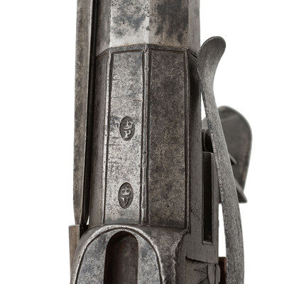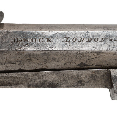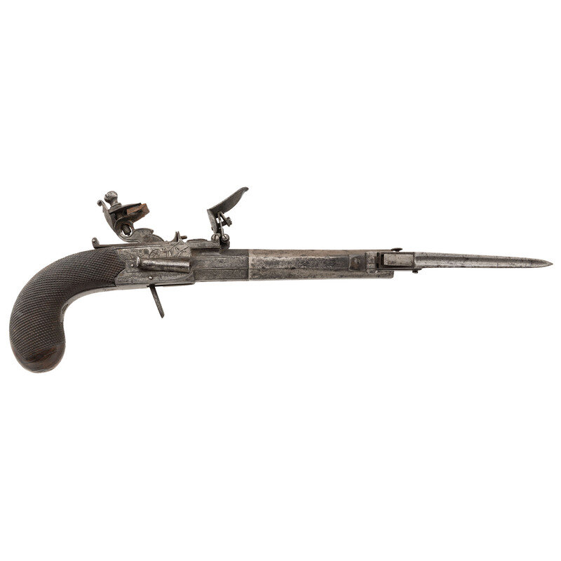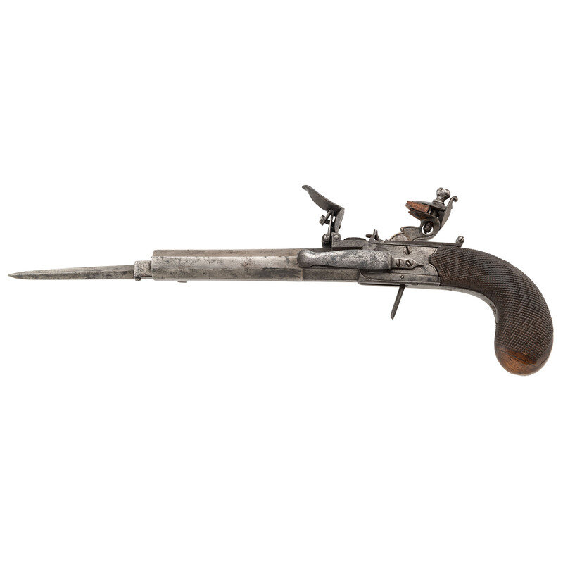 .48 caliber. 3.5" octagonal barrel. NSN. Bright finish, checkered walnut grip. Single shot twist-off barrel rifled flint box lock pistol with sliding pan locking safety, folding trigger, right side mounted 3" blade snap bayonet and left side mounted belt hook. Right side of frame engraved with panoplies of arms, bottom of the frame with London gunmakers proof marks. Top of barrel engraved H NOCK LONDON. Henry Nock worked in London circa 1770 until his death in 1804. During that time he built a number of innovative firearms for the Board of Ordnance including the Nock Volley Gun, his various "inside lock" handguns, carbines and muskets and contracted to produce arms not only for the British Government but also for the British East India Company.