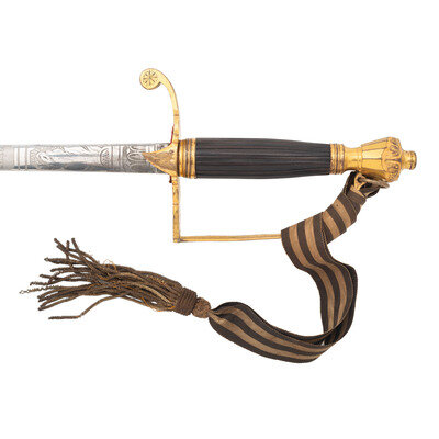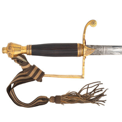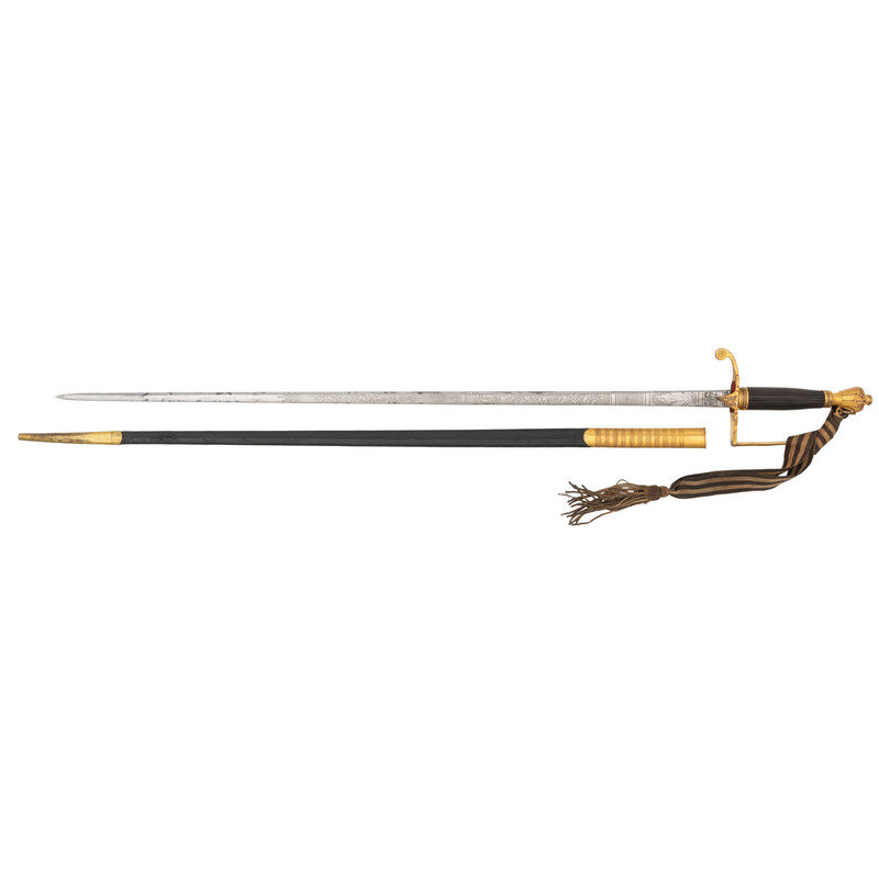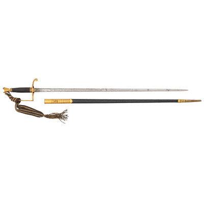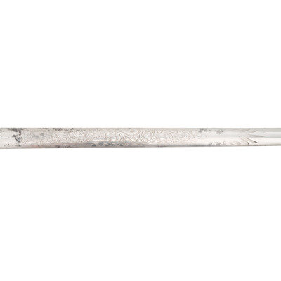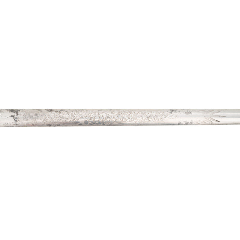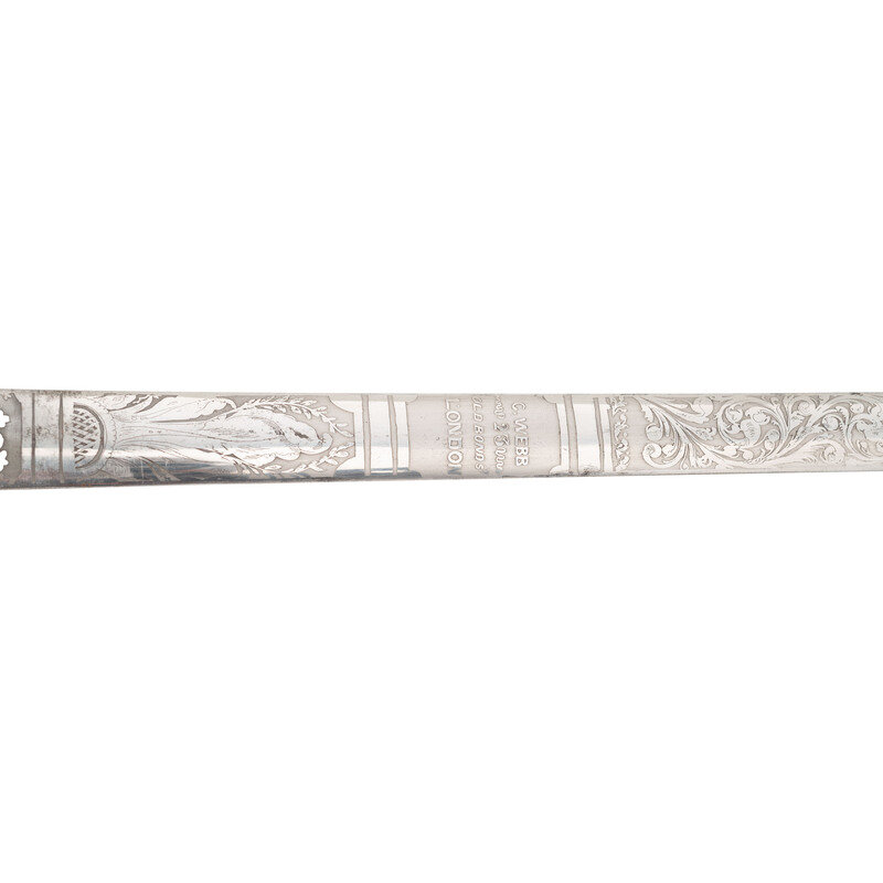 29" straight tapered spear point blade, .75" wide at the ricasso. 34.875" in overall length. 5.875" hilt with gilt brass knuckle bow, faceted urn shaped pommel cap, pointed langets and a forward swept disc shaped upper quillon. Dark brown reeded grip appears to be horn. Blade decorated with flowing acid etched foliate motifs with the central image on both sides being a {CROWN} over a highly stylized and intertwined "VR". Reverse blade etched in four lines C. WEBB/23/OLD BOND St/LONDON. The sword is accompanied by a gilt brass mounted leather scabbard with a shell motif frog hook. A gilt bullion and ribbon sword knot is attached to the grip. Charles Webb worked in London circa 1873-1857.