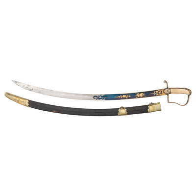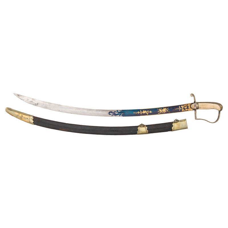 30.75" curved single edged blade, 1.3" wide at ricasso. 35.5" in overall length with a 4.875" hilt. Hilt with silvered brass reverse-P knuckle bow mounted with langets on either side of the guard and a forward swept disc shaped upper qillon. Grip of checkered ivory. Spine of blade stamped with a script maker's mark that reads JS&Co for John Salter & Co. Blade decorated with 14.75" of blue that terminates in flowing foliate patterns, with gilt highlighted engraved floral and martial themes. The inclusion of Liberty Caps in both of the panoplies of arms on the obverse of the blade, along with stars on the shield implying the "Shield of Columbia" strongly suggest that the sword was made for the American market. The sword is accompanied by a brass mounted leather scabbard that is about .5" short of allowing the sword to seat fully. John Salter and his brother George were the sons of William Salter, who had established a spring business with his brother Richard in the 1760s. John & George took over after Richard's death in the 1790s and added edged weapons to the product line. In 1824 John died, and George took over the business which was renamed George Salter & Co. The "JS&Co" marking indicates that the sword dates from circa 1790s-1824.