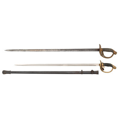 Blades range from 31.5" to 34". One example features a folding guard with pierced {Eagle} pattern, and the ricasso struck with the CK/Co. logo of Carl Kaiser & Co. of Solingen. Comes in a blued steel scabbard and features a double fullered blade. The other sword features a shagreen hilt with etched panoplies of arms to the blade and weakened maker markings.