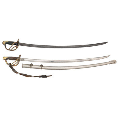 1) US Model 1860 Light Cavalry Saber with no visible maker's mark. 34.25" slightly curved single edged blade with 27" stopped median fuller. 40.75" in overall length. 6" hilt with cast brass two-branch guard and knuckle bow and grooved leather covered wood grip with 12 wraps of twisted wire. Ricasso with no visible maker's mark and with weak, only partially legible date and inspector mark. No scabbard present.