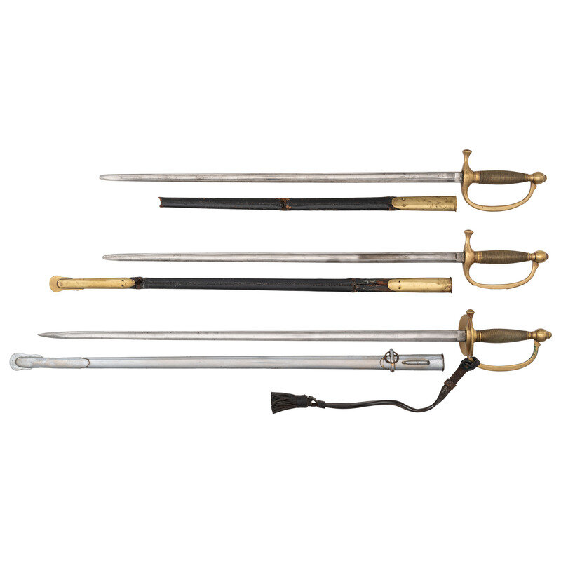 3) Emerson & Silver Model 1840 NCO Sword dated 1863 with later pattern metal scabbard. 31.75" straight spear point blade. Nearly full-length stopped median fuller. 6.25" cast brass hilt with grooved grip, single knuckle bow and dual kidney shaped guard and counterguard. Includes a later pattern steel scabbard and a leather sword knot.