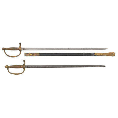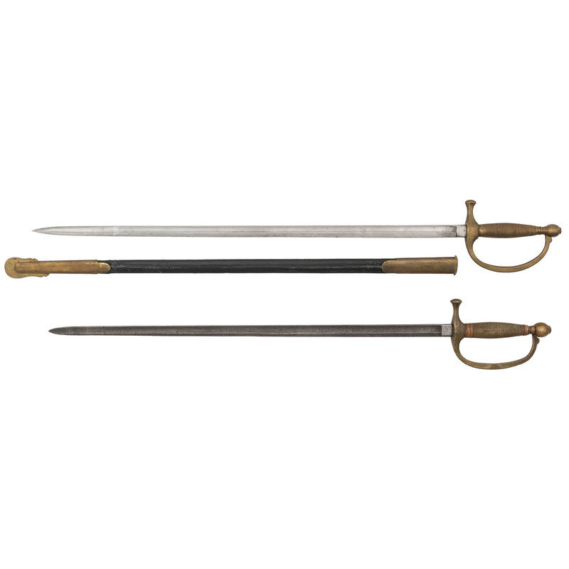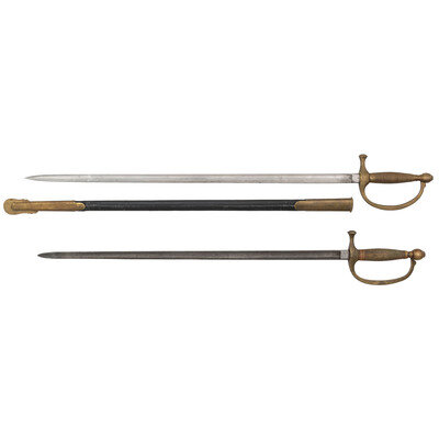 1) Collins & Co marked 26" straight spear point blade with full-length stopped median fuller. 32.25" in overall length. 6.25" cast brass hilt with knuckle bow and ribbed brass grip. No scabbard is present.