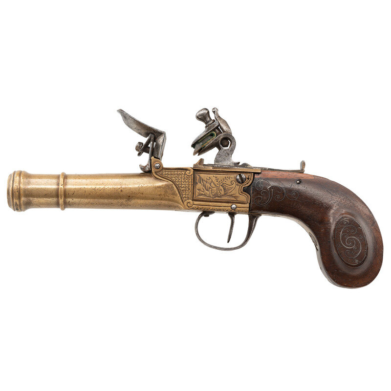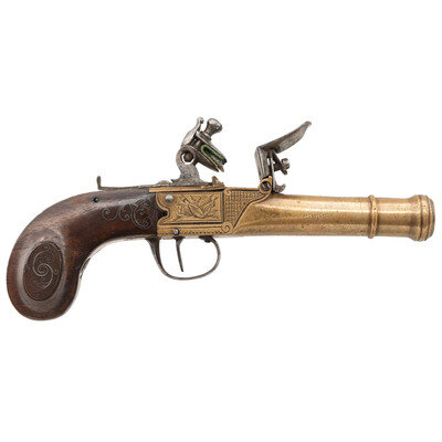 .50 caliber. 3" round brass cannon barrel pistol. NSN. Brass barrel and frame, iron flint battery, triggerguard, silver wire inlaid walnut grip. Single shot smoothbore muzzleloading flint box lock pistol with pan locking sliding safety. Frame engraved with panoplies of arms and simple geometric patterns.