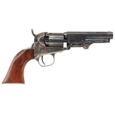 .31 caliber. 4" barrels. SN: 343110. Blued finish with casehardened frame, hammer, and loading lever mounting silver plated gripstraps and one piece varnished walnut grips. Single action five-shot percussion revolver with octagonal barrel mounting front brass bead and hammer notch rear sights. Top of the barrel struck ADDRESS SAML COLT/NEW-YORK CITY. Cylinder and left frame are struck COLT'S PATENT. Cylinder roll engraved with Ormsby's Stagecoach Holdup scene. Backstrap is engraved with Samuel Colt's signature. Serial numbers match. Comes in a gray cardboard box with the lid marked COLT BLACKPOWDER.