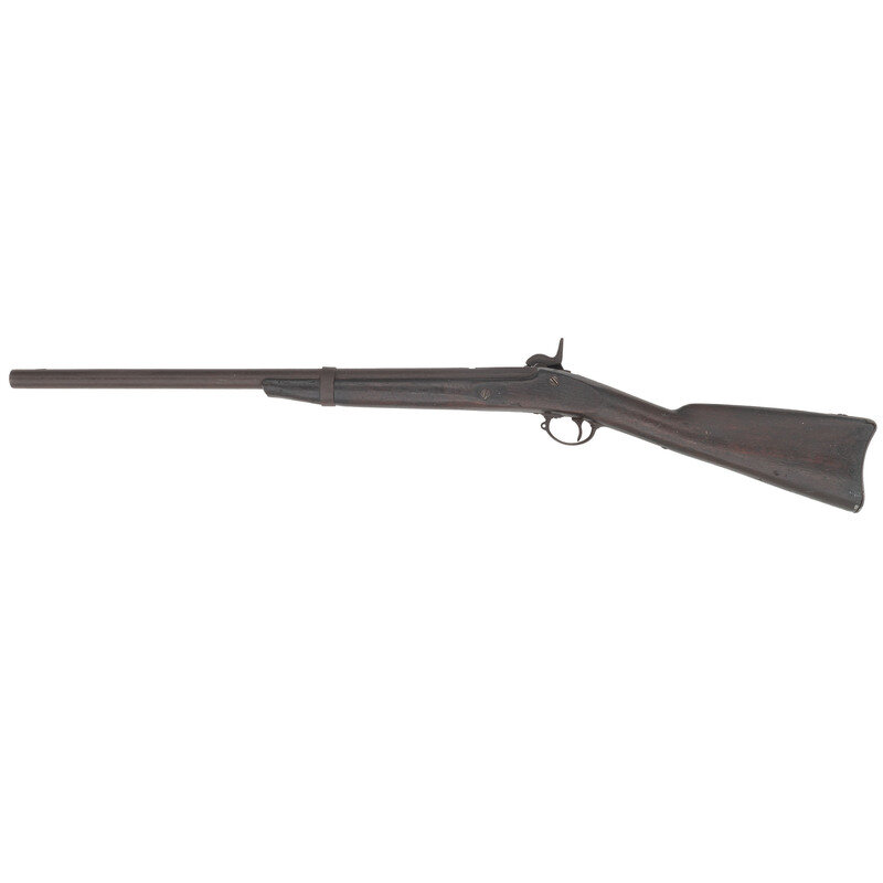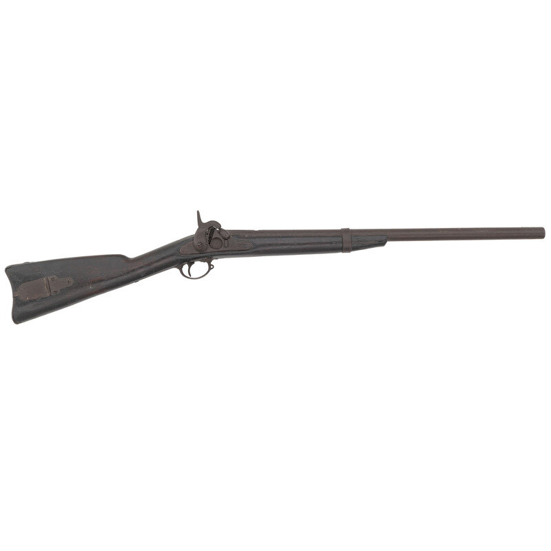 .58 caliber. 24.875" barrel. NSN. Bright finish, iron furniture, walnut stock. Single shot muzzleloading percussion ignition rifle cut down to carbine length with Maynard automatic tape priming system, missing both front and rear sights, primer magazine door and sling swivels. Lock with two line U.S./HARPER'S FERRY mark forward of the primer magazine and no legible date at rear. No legible date on breech, no legible US on buttplate. Wood without visible cartouches. Stock cut back to within 2.75" of the rear band, which remains intact with the band spring.