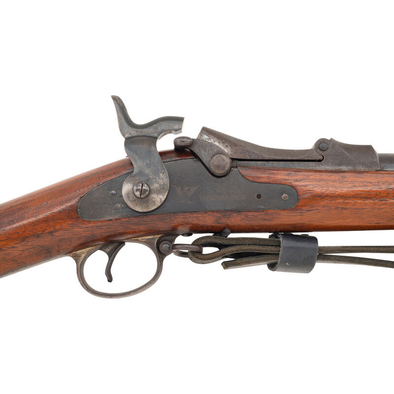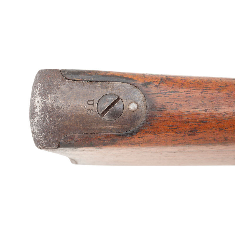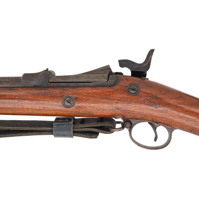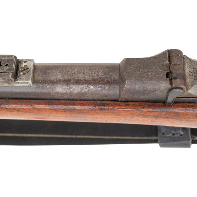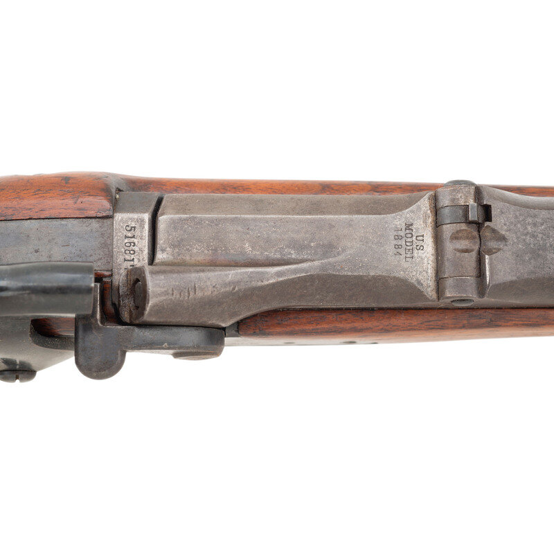 .45-70. 32.25" barrel. SN: 516817. Blued and color casehardened finish, walnut stock. Single shot breechloading military rifle. Standard Springfield markings on lock and breech block. Weak SWP/1891 cartouche on reverse wrist and {Circle-P} behind triggerguard. Low arch breech, one-piece triggerguard, grooved trigger with checkered tip, two-click tumbler, Buffington rear sight, musket front sight with pinned blade, ramrod bayonet, trap in butt for tools which are not present. Retains both sling swivels and the stacking swivel. Includes an incorrect pattern reproduction sling.