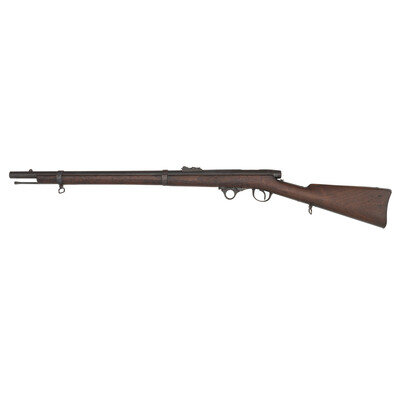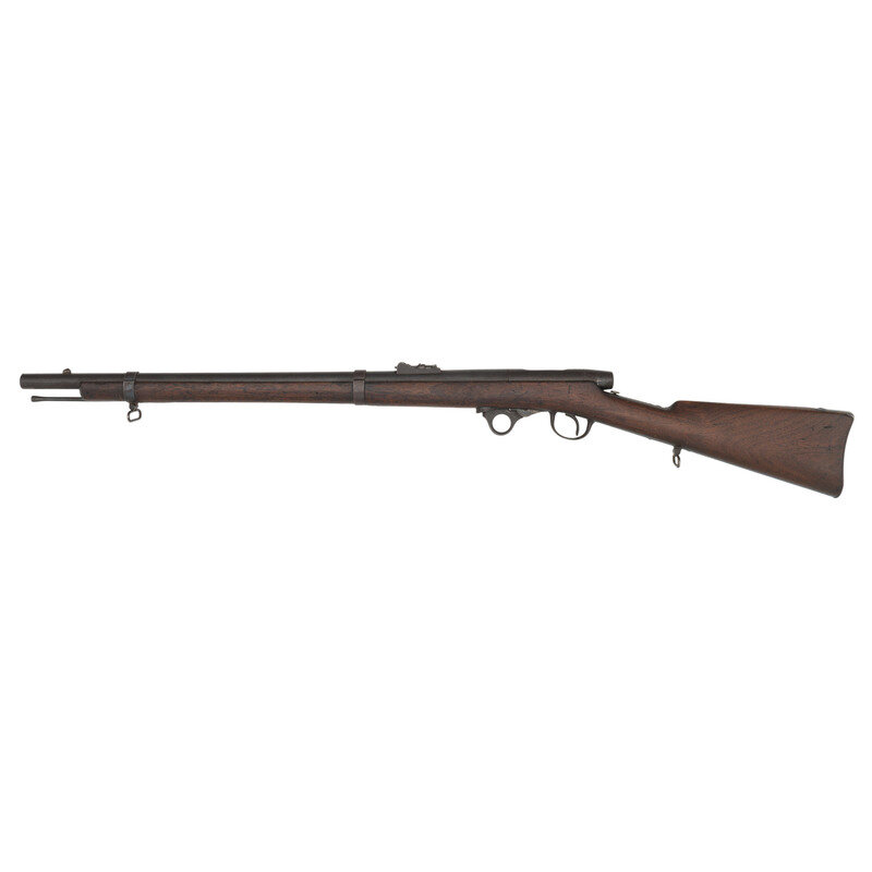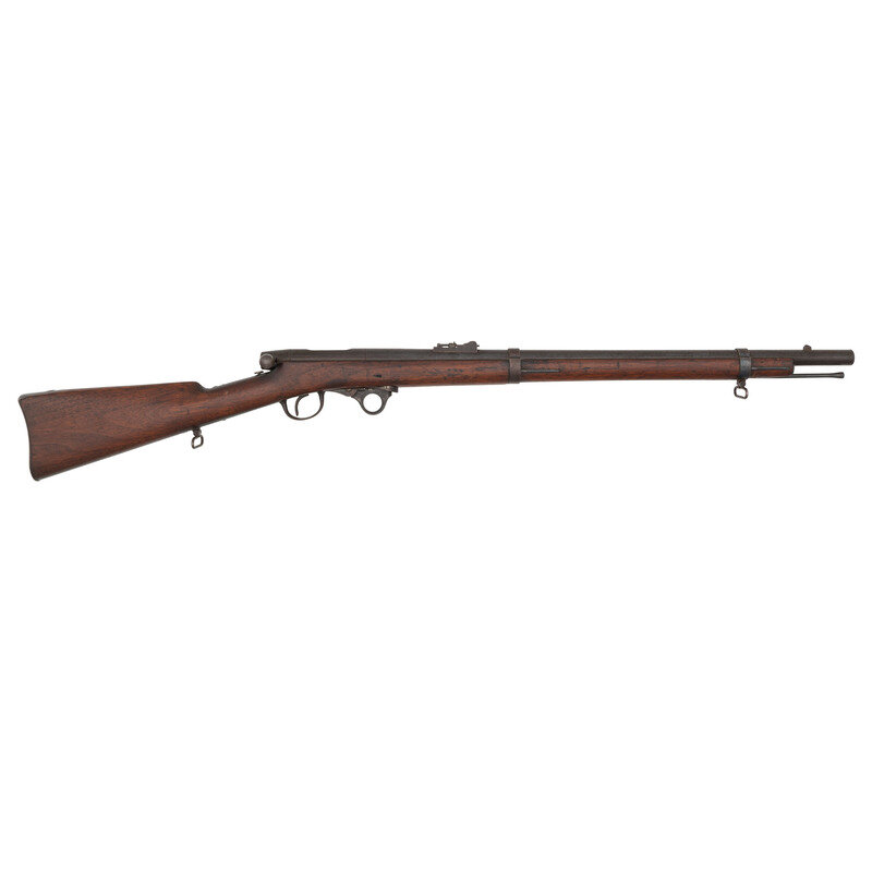 .52 caliber. 26.5" barrel secured by two flat spring retained barrel bands. SN: 4539. Blued finish, iron furniture, walnut stock. Single shot breechloading bolt action percussion underhammer military rifle with Lancaster's patent "oval bore" mechanical rifling that appears to be smooth but has very minor differences in the diameter of the major and minor axis of the bore. Rifle has been shortened to carbine length a very long time ago. The barrel has been shortened about 8.5" and the forend cut back appropriately, with the front sight reset and the upper barrel band removed. It retains the Enfield style military ladder rear sight, a musket style base and blade front sight, both sling swivels and a shortened trumpet head cleaning rod that is not the correct pattern. The butt trap does not retain the cleaning tool, but two lead bullets are inside, a flat bass three-ring elongated ball and a round ball. Both are nominally .53 caliber. Standard Greene markings on the upper receiver tang. The Greene rifle holds the distinction of being the first bolt action rifle to be purchased by the US Ordnance Department, with 900 being delivered in March of 1863, a smaller number were acquired by various militia regiments early in the Civil War and some 3,000 were sold to the Russians. Total production was about 4,500 circa 1859 to 1863.