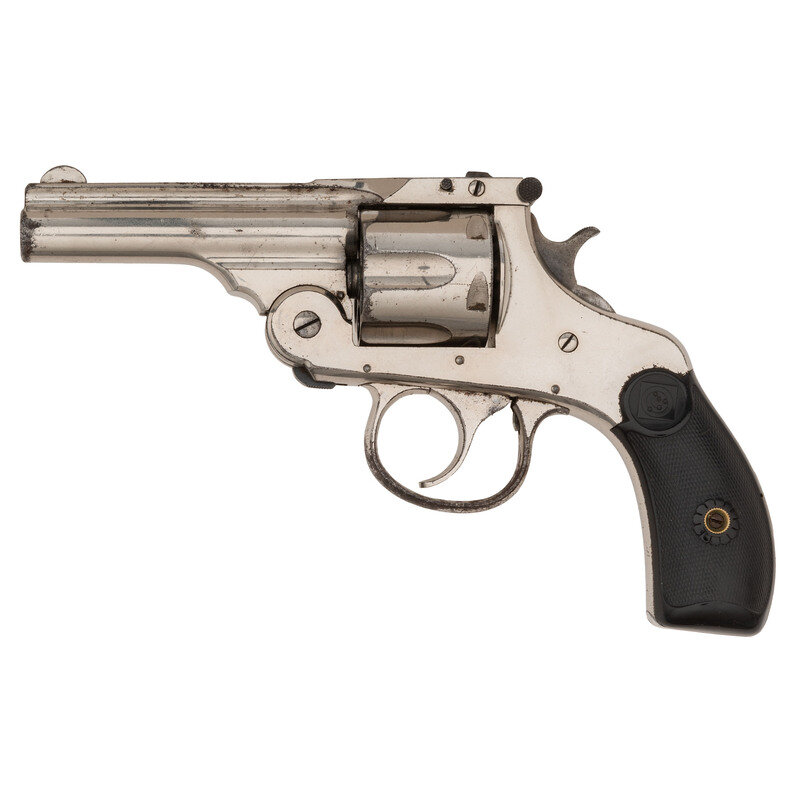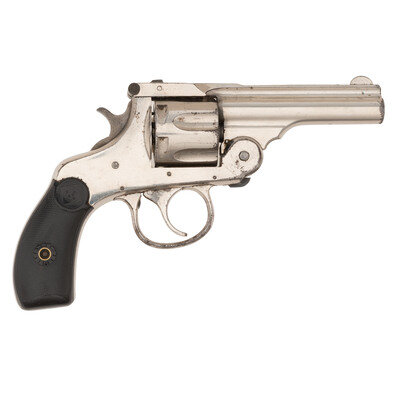 .32 S&W. 3.2" barrel length. SN: 722. Nickel plated finish with case colored hammer mounting checkered hardrubber {Target} logo grips. Double action six shot top break revolver with automatic ejection. Item mounts half moon front blade and rear latch notch. Fluted barrel rib is stamped HARRINGTON & RICHARDSON ARMS CO/WORCESTER MASS. U.S.A. PAT'D OCT. 4 '87. Serial numbers match.