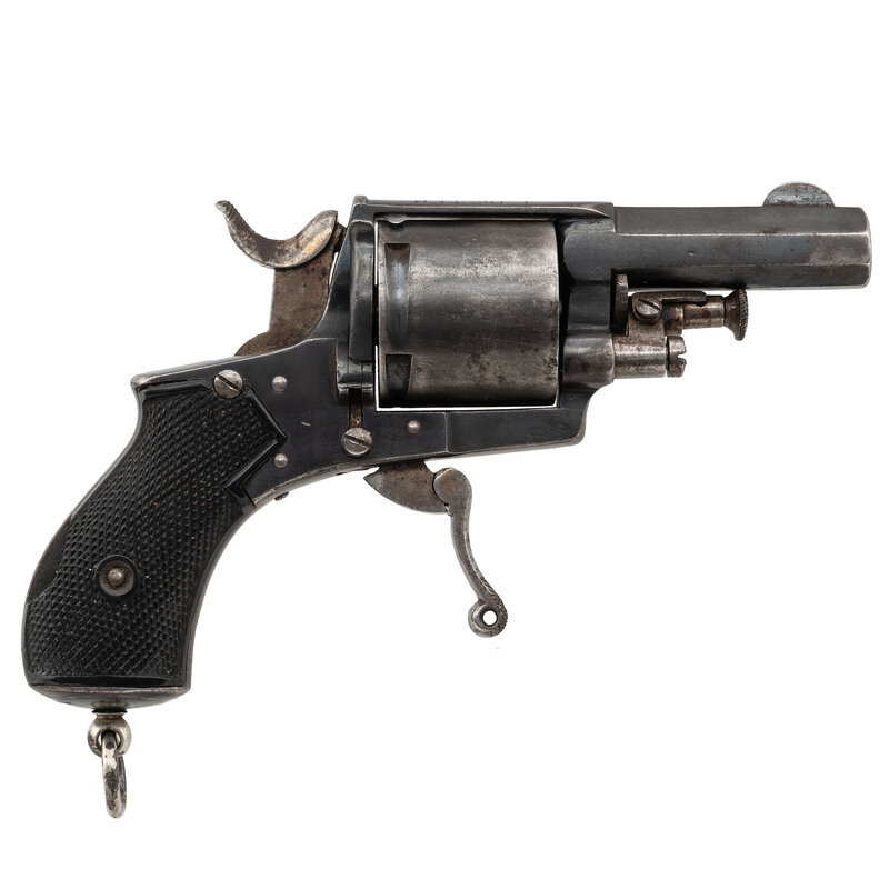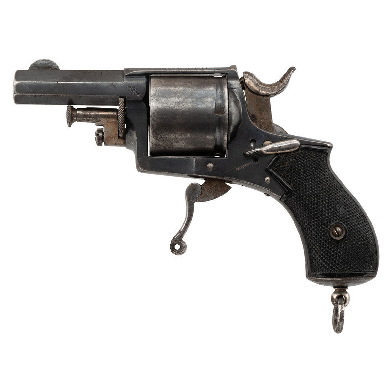 .320 CF. 2" octagonal barrel. SN: 15. Blued metal finish with straw colored small parts mounting checkered black synthetic grips. Double action folding trigger exposed hammer Velo-Dog revolver with octagonal barrel mounting half moon front blade and topstrap notch rear sights. Left barrel struck with 320 caliber marking with German proofs to frame. Topstrap is struck L. DIETER/MUNCHEN. Revolver mounts a hand operated ejector rod, and a safety lever to the left frame.