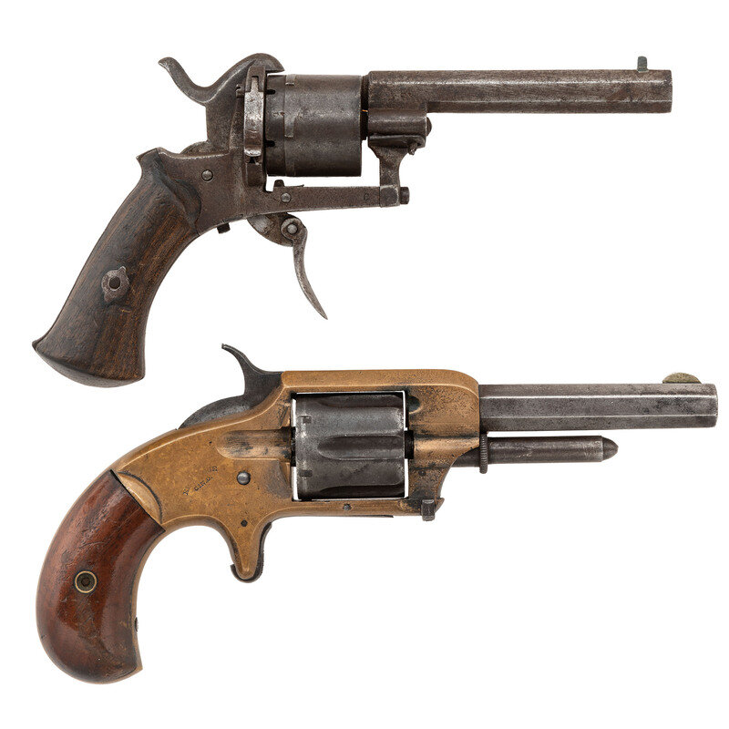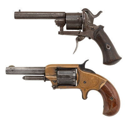 2.) 7mm Pinfire. 3.375" barrel length. SN: NSN. Brown patina overall mounting walnut two piece grip panels with octagonal barrel mounting front blade and hammer rear notch sights. Double action six-shot loading gate revolver. Right barrel shows {Star/L} proof with frame struck by C stamp. Item is missing the ejector rod. Front of the cylinder pin has sheared off.