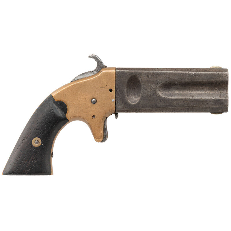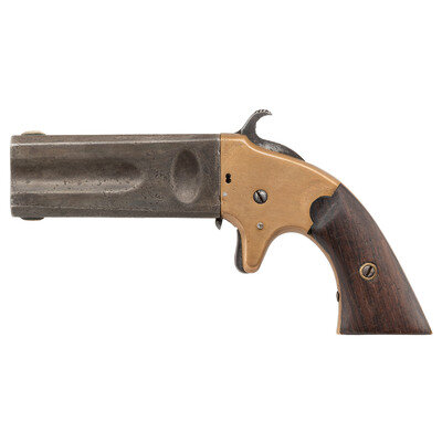 .22 Rimfire/.32 Rimfire. 3" barrel length. SN: 3658. Blued metal finish with silver plated brass frame and mounting square butt rosewood grips. Single action hand indexed two-shot derringer with German Silver front blade sights to each barrel. Patent mark struck above the .32 caliber barrel reads WHEELER'S PAT. OCT. 31 1865-JUNE 19 1866. Top of the .22 caliber barrel reads AMERICAN ARMS CO. BOSTON, MASS. Serial number on frame and interior of right grip panel matches.
