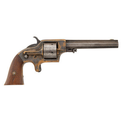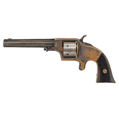 .42 Cup Fire. 5.5" ribbed octagonal barrel. SN: 1097. Blued finish, silvered brass frame, two-piece smooth walnut and rosewood grip panels. Single action metallic cartridge revolver with six-chambered un-fluted front loading cylinder, rear of frame mounted ejector rod, frame notch rear sight and German silver blade front sight. Plant marking on barrel rib, Merwin & Bray marking on left of barrel. Patent date markings on cylinder. Left grip panel of rosewood and numbered to the revolver, right grip panel of walnut and unnumbered.