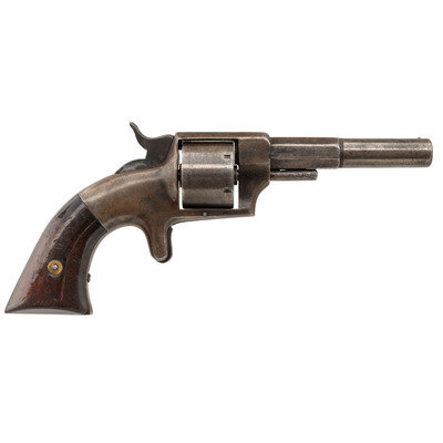 .32 Rimfire. 3.675" barrel length. SN: 664. Blued metal finish with octagonal to round barrel mounting varnished walnut grips and topstrap notch with front bead sights. Single action six shot cartridge revolver with spur trigger. Upper barrel flat is struck HOPINS & ALLEN MFG. CO/NORWICH. CT. Serial numbers match on the barrel, frame, and cylinder. Replaced cylinder pin.