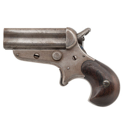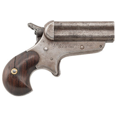 .32 Rimfire. 2.5" barrel length. SN: 10036. Gray patina overall mounting rosewood birdshead grips and a brass bead front sight. Single action four-shot derringer pistol with rotating firing pin and bullseye knurled catch to left frame. Right frame struck with maker and patent mark C. SHARPS PATENT/JAN. 25. 1859.