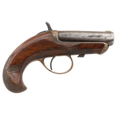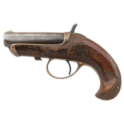 .41 Rimfire. 2.5" barrel length. SN: 6312. Blued metal finish with silver plated frame and triggergouard mounting walnut birdshead stocks with bordered checkered butt and engraved embellishments. Single shot single-action sliding barrel derringer pistol with half cock safety and front blade and rear hammer notch sights. Left barrel is struck WILLIAMSON'S PAT. OCT. 2. 1866 NEW YORK with upper barrel engraved with an {Arrow} mark to instruct users in basic operation. The frame and triggerguard feature spiral scrollwork with sunburst to forward frame.