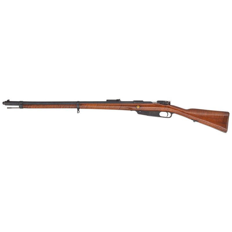 7.92x57mm. 29.1" barrel length. SN: 6521S. Blued metal finish with polished bolt set in polished and refinished walnut straight wrist stock with tiger stripe pattern. Bolt action internal magazine fed repeating rifle updated with stripper clip charging. Item features a full length barrel shroud and mounts adjustable ladder rear notch and inverted-V front blade sights. Receiver is struck S/LOEWE BERLIN/1890, and additionally shows Imperial German Gothic letter inspection stamps. Left receiver struck with the GEW. 88 model mark that is partly removed with the cutout for stripper clip charging. Cover plate installed over the magazine well with stock missing the lower sling loop. Item mounts updated rear sights with Arabic numerals. A new serial number is struck into the receiver reading 7974. Barrel, receiver, and bolt show matching serial numbers.