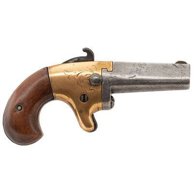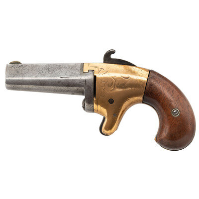 .41 Rimfire. 2.5" barrel length. SN: 5763. Blued metal finish with brass frame mounting smooth walnut birdshead grips, German Silver front blade sight, and spur trigger. Single shot rotating barrel breechloading derringer with light spiral scroll engraved embellishments to frame and barrel flanks. Barrel flat address is nearly obliterated with only faint traces of the BROOKLYN, N.Y. marking visible.
