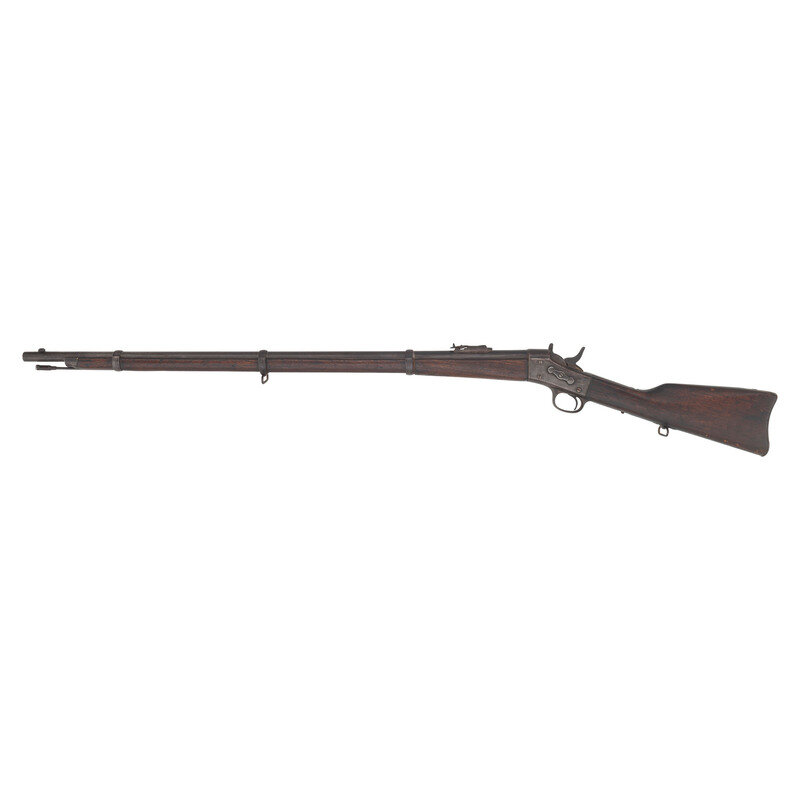 .43 Spanish. 35" round barrel secured by three solid, spring retained barrel bands. SN: 18898. Heavily oxidized metal, walnut stock and forend. Single shot breechloading metallic cartridge military rifle with adjustable ladder rear sight, musket style front sight/socket bayonet lug and sling swivels. Weak Remington markings on the tang.
