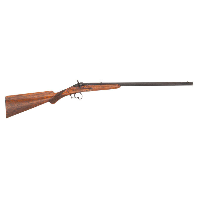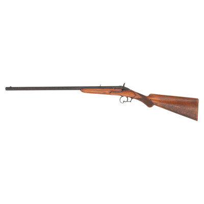 .22RF (exact chambering not identified). 22.5" octagonal barrel. NSN. Blued finish, iron furniture, checkered hardwood pistol-gripped stock. Single shot breechloading Warnant action rifle with automatic extractor, fixed block rear sight and dovetailed blade front sight. Unmarked except for Liege proof marks.