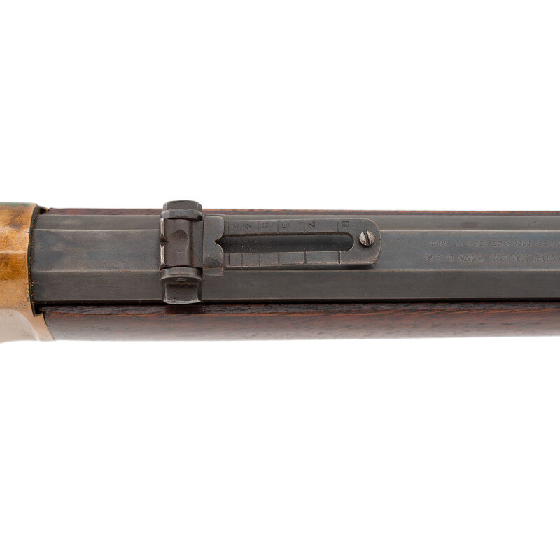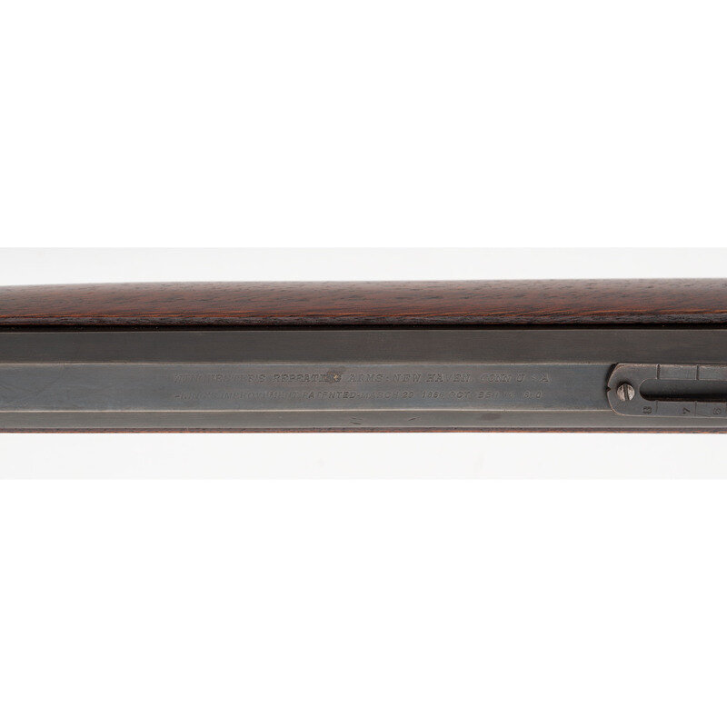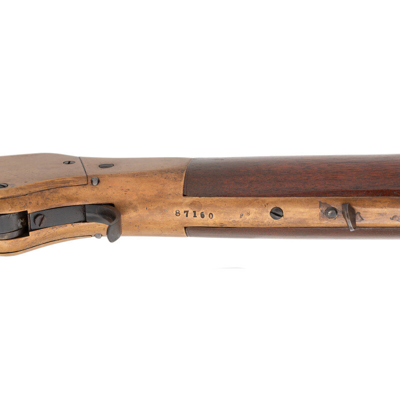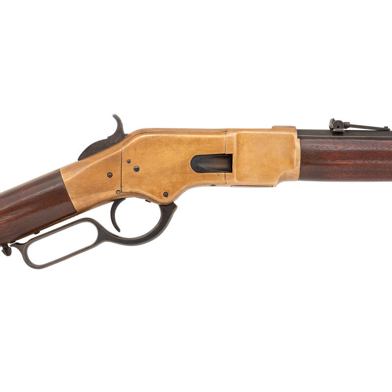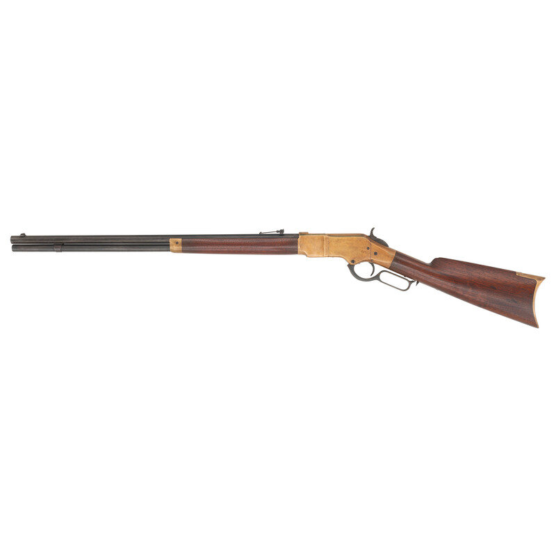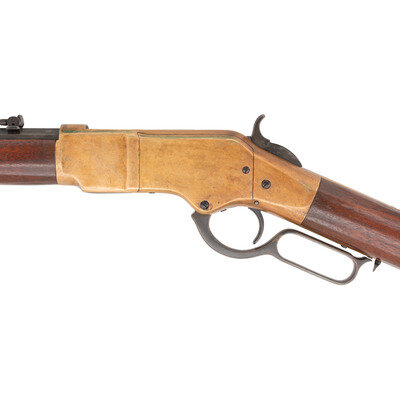 .44RF Henry. 24" octagonal barrel. SN: 87160 (mfg. ca 1871). Blued finish, brass frame and furniture. Lever action tubular magazine fed repeating rifle with dovetailed ladder rear sight gradated to "8" and dovetailed blade front sight. Two line barrel address with "King's Improvement" patent mark. Trap door in butt with reproduction cleaning rods.