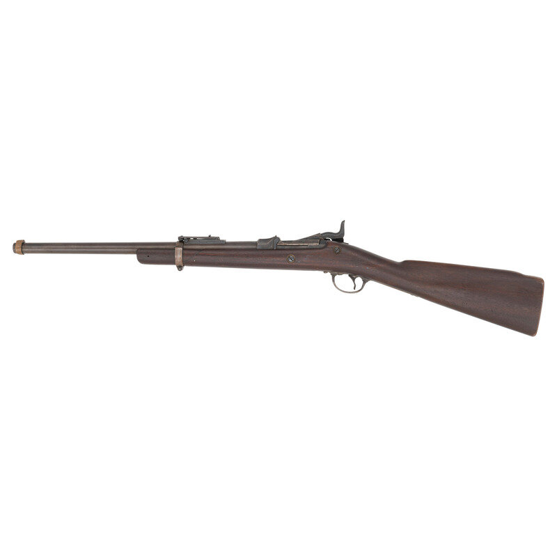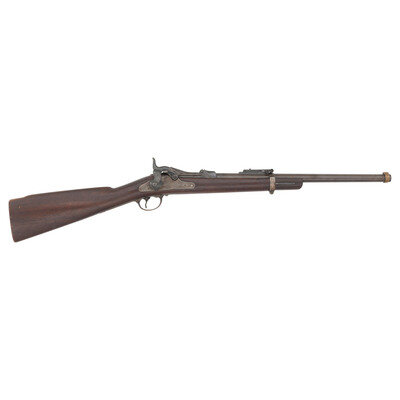 .45-70. 18.5" barrel. SN: 375128. Blued and color casehardened finish, walnut stock. Single shot breechloading trap door action military rifle, altered to sporting rifle. 1873 dated locks shows some machine marks around the edges, low arch breech with three line "1873" marking. Two-piece triggerguard with bow machined down to only .5" wide. Buttplate removed, butt shortened to a 13" length of pull, butt thinned and tapered, forend shortened and removed, barrel shortened with a brass band added at the muzzle for a front sight, which is missing the blade. Model 1884 rifle ladder rear sight. Tang drilled with two holes. Swivels removed, some screws replaced.
