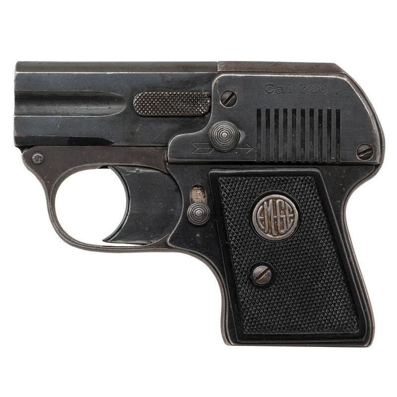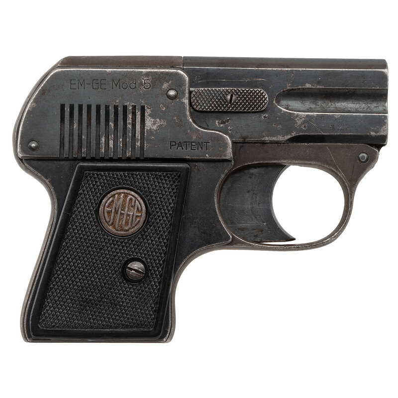 .320 Cal. 2.25" barrel length. SN: NSN. Blued metal finish mounting checkered black synthetic grips with EM-GE medallions and a continuous upper notch sight. Two-shot over/under derringer pattern pistol with safety catch to left frame and hand operated extractors. Manufacturer marking to the right frame reads EM-GE Mod. 5 followed by PATENT. Caliber mark on left frame reads Cal. 320. Better known for their air guns, the German firm of EM-GE (Moritz & Gerstenberger) manufactured the Model 5 pistol as a blank, gas cartridge, and flare pistol intended for self defense.