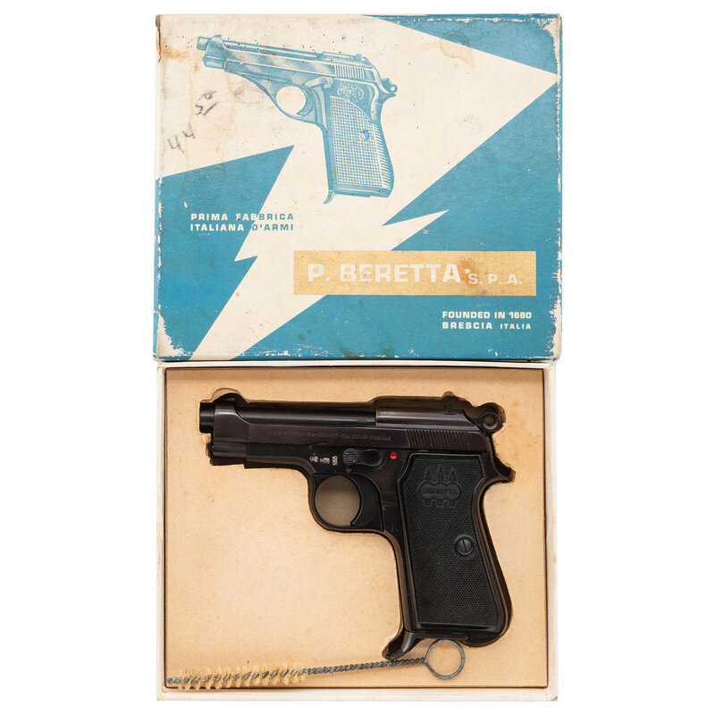.22LR. 3.25" barrel. SN: 88995N. Black Anodized finish to aluminum frame with remaining parts blued mounting checkered black synthetic Beretta logo grips. Single action simple blowback operated autoloading pistol fed by detachable single stack magazines. Left slide is struck P. BERETTA-Gardone V.T.-Cal. 22LR-Mod. 948. Right slide marked MADE IN ITALY. Further markings include Italian smokeless firing proof marks to the frame and barrel. Item comes in original cardboard box with nylon cleaning rod.