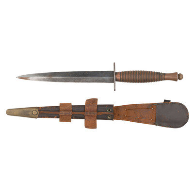 6.875" double edged spear point blade with prominent median ridge, 11.675" in overall length. Unmarked 2" oval metal guard, 4.5" cast alloy hilt with screw pommel cap and cast gripping ridges. Hilt struck with a small {Broad Arrow} near pommel cap. Blued blade, blackened alloy hilt. Includes a leather scabbard with elastic hilt retention strap.