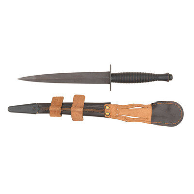 6.875" double edged spear point blade with prominent median ridge, 11.375" in overall length. 2" oval guard, 4.5" cast grip with palm swell and grasping ridges. All metal surfaces are blackened. Top of guard marked GIBBERSON & CO/SHEFFIELD and NATO No/4558827/1976. Includes a brown leather scabbard with blackened metal drag and elastic hilt retention strap.