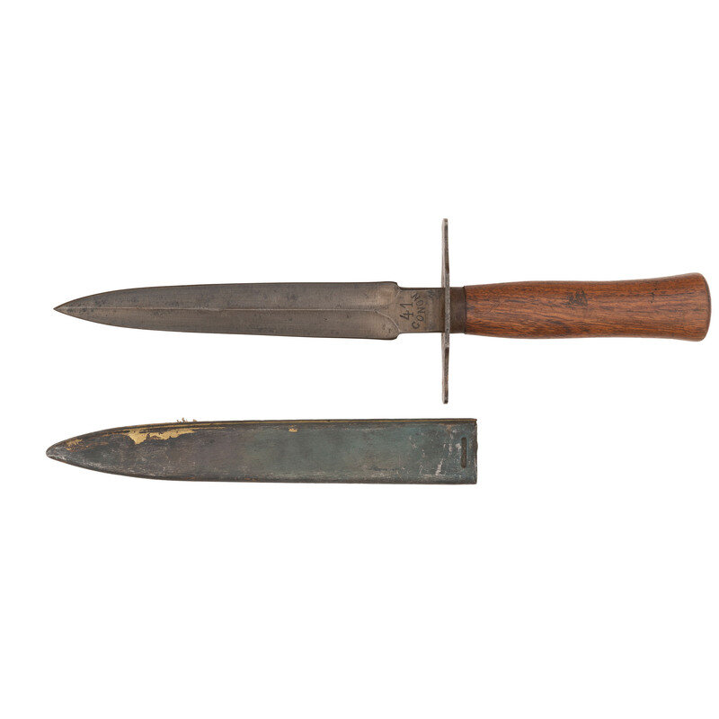 6.5" double edged spear point blade with prominent median ridge, nominally 11" in overall length. 3.125" long sheet steel guard with weak {Star}/B inspection mark on top. One piece wood grip with palm swell, Type II sheet metal ferrule behind guard and flat spanner style capstan nut. Obverse ricasso stamped 41/GANON. Knife includes the correct pattern blued stamped sheet metal scabbard with metal belt loop.