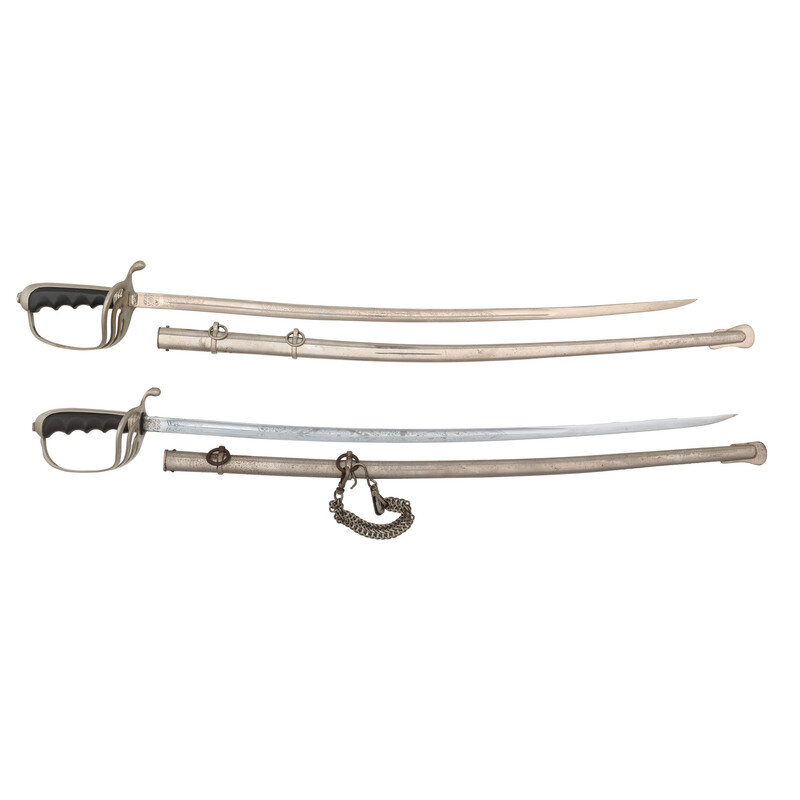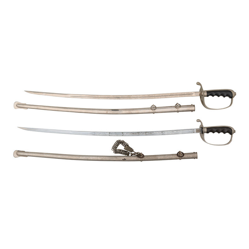 29.75" blade lengths. 36.25" overall with scabbard and hilt. Pair of curved single edged sabers with single fullered blades mounting triple branched knuckle bows with nickel plated hilts and black synthetic grips. Both blades display etched patterns including panoplies of arms, the Star of David, and the national motto to the right flanks and US initials to the left. Maker marks include N.S. MEYER and GEMSCO to the ricassos. Both swords come with nickel plated scabbards, one mounting a hanging chain.