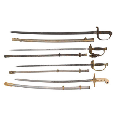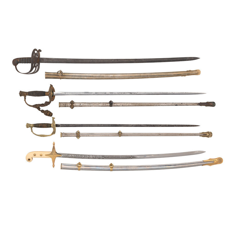 Lot includes swords struck with the maker markings of M.C. LILLEY & CO., RIDABOCK & CO, and one modern Marine Corps Mameluke sword with etched USMC to ricasso. Period swords feature wire wrapped shagreen hilts with the Mameluke sword mounting imitation ivory grips. All swords come with metal scabbards, and all display etched patterns to the blades. Lilley & Co sword comes in a non matching scabbard.